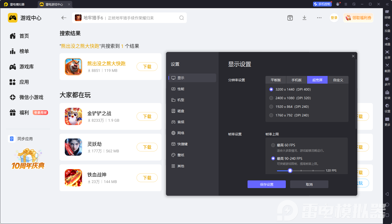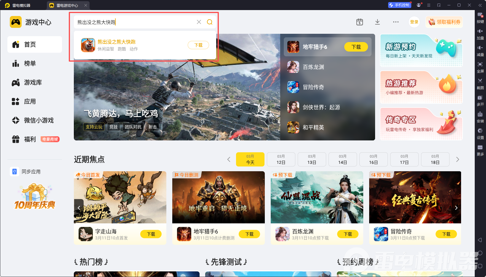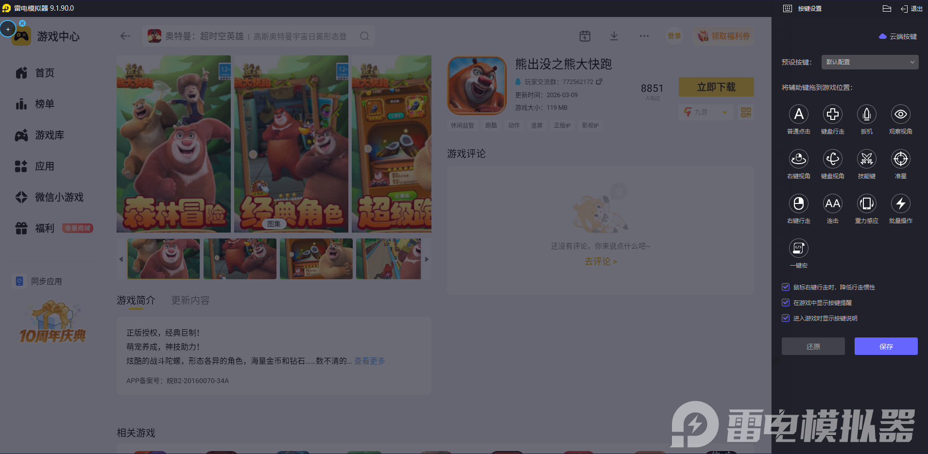 启动模拟器后,在内置的雷电游戏中心搜索“熊出没之熊大快跑”,找到对应游戏后点击下载,下载安装完成后双击图标,就能直接进入游戏游玩。