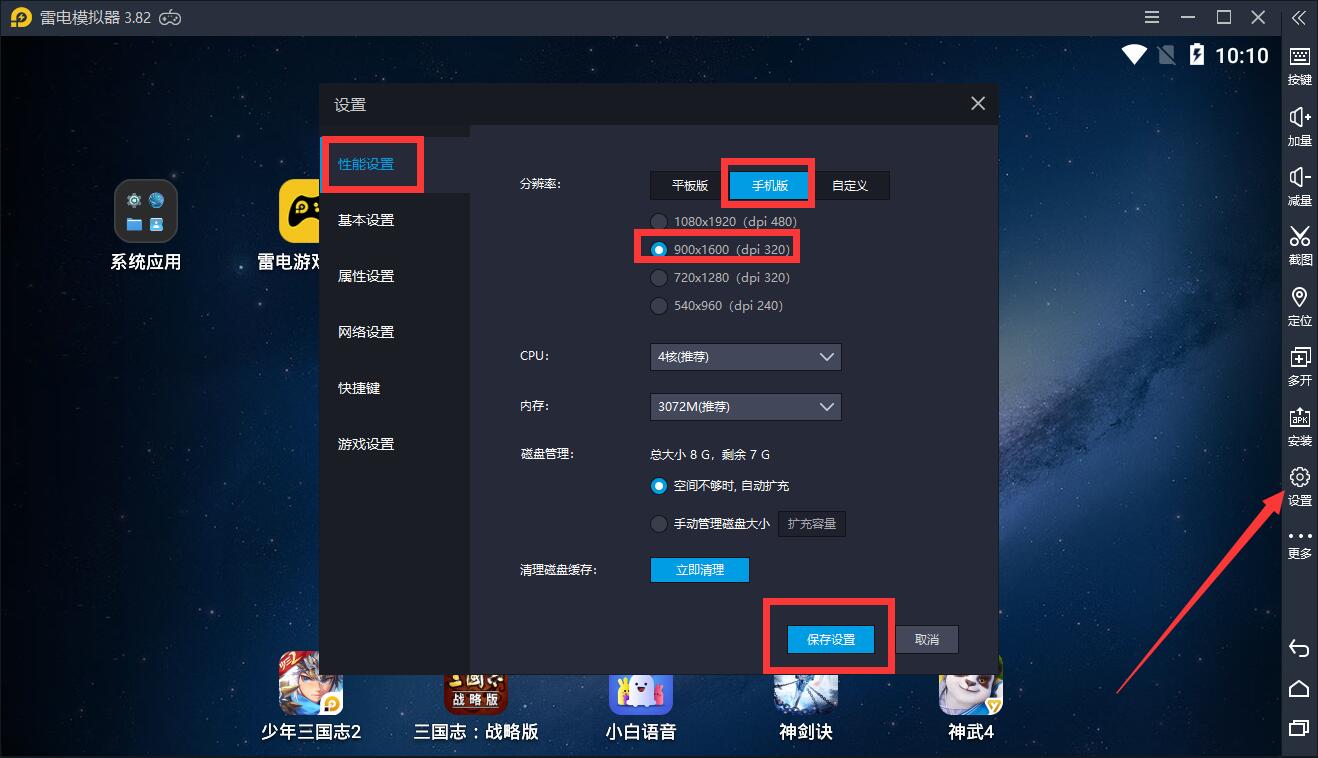 打开模拟器右边设置,展开性能设置,选择手机分辨率,点击下面其中一个比例选项后保存设置