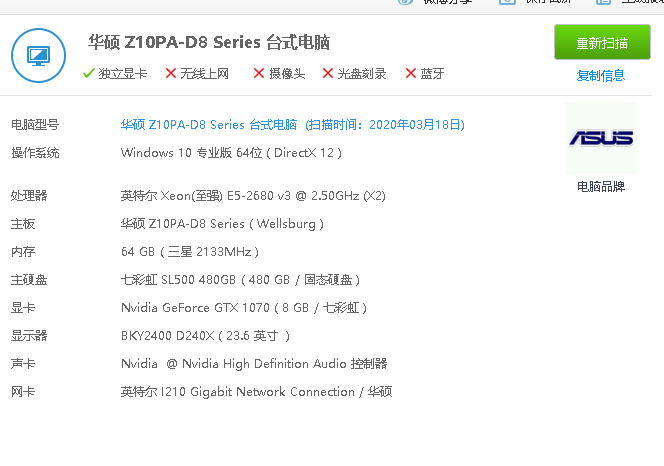 这是我的诊断,对于双路1+1不等于2 我相信,我也知道,。同等2680v2单路开模拟器1050 4 的显卡带着辅助运行可以17妥妥的,