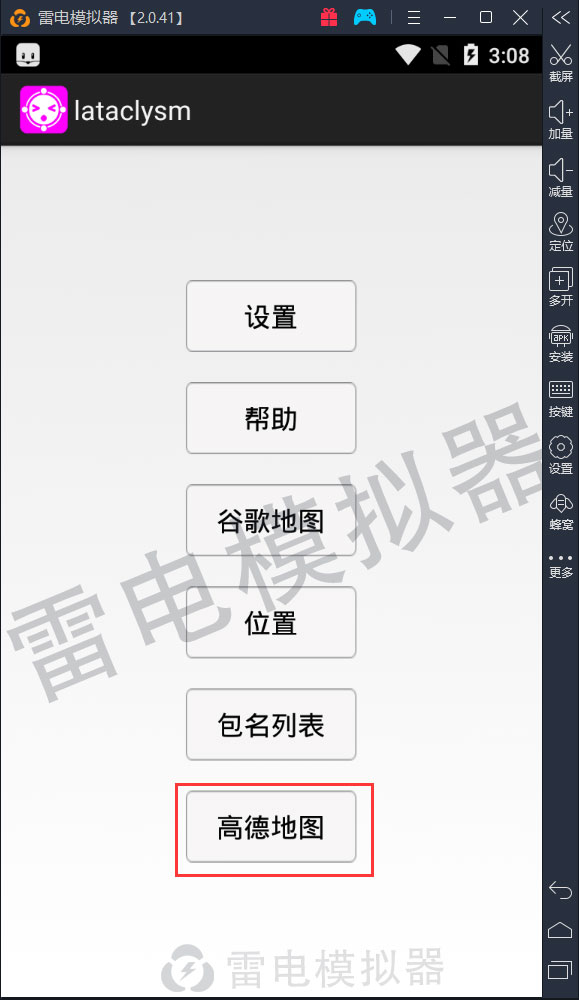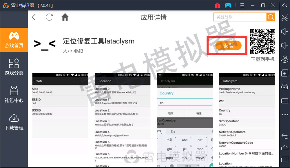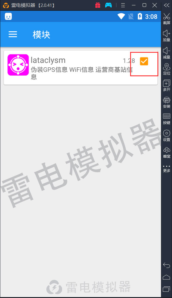 1.先在模拟器的雷电游戏中心里下载安装“Xpose框架”和“定位修复工具lataclysm”。(安装完xpose框架需要重启模拟器)