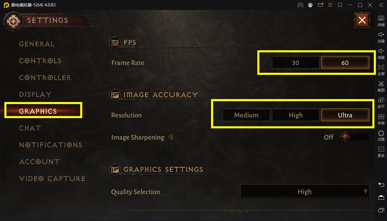 3.打开游戏内设置,对应以下图片位置可以开启高帧率以及高画质