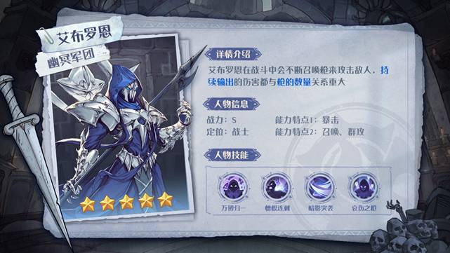 【艾布罗恩】在战斗中会不断召唤枪矛来攻击敌人,持续输出的伤害都与枪的数目密切相关。而他的终极技【万仞归一】则会召回之前投掷出的所有哀伤之枪,每把枪在飞行过程中会对路径上的敌人造成大量伤害,同时还为自己加攻加敏,一举多得!搭配幽冥军团最坚实的壁垒——【厄瑞玻斯】,二者一矛一盾,可谓攻守兼备!