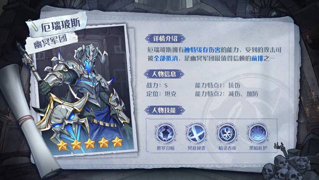 【厄瑞玻斯】拥有独特缓存伤害的能力,一定时间内受到的攻击可被抵消,是幽冥军团最值得信赖的前排之一!