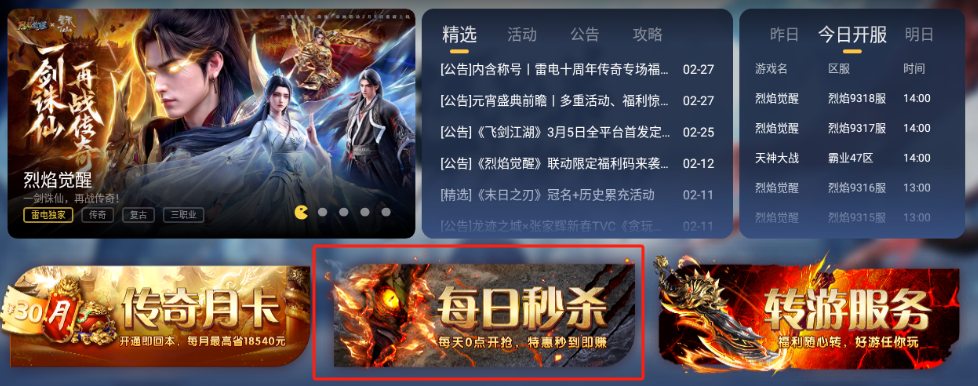 桌面点击【雷电游戏中心】在首页点击【传奇专区】
