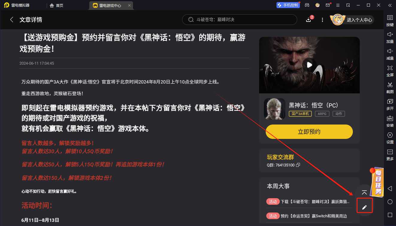即刻起在雷电模拟器预约游戏,并在本帖下方留言你对《黑神话:悟空》的期待或对国产游戏的祝福,