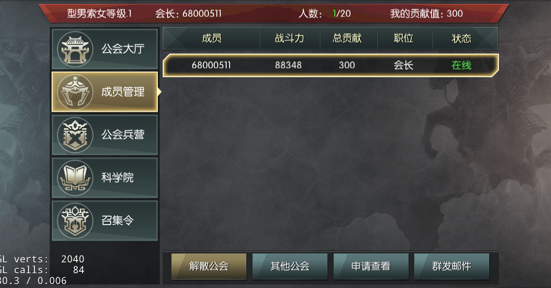 公会成员管理界面可以查看公会成员的战斗力、贡献值、在线情况等,另外在这里也可以给公会成员群发邮件;