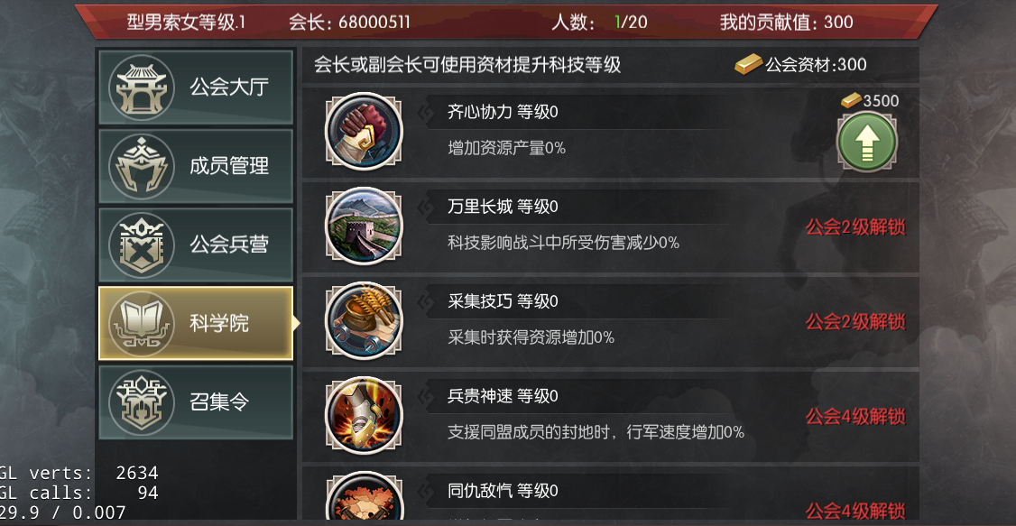 科学院中可以使用公会资材升级公会科技,公会科技可以给公会成员带来各种加成,公会等级越高,可以解锁的公会科技也越多。