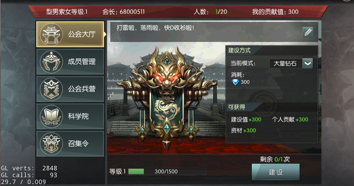 在公会大厅中,每个玩家每天可以参与公会建设1次,建设分“铜币”、“少量钻石”、“大量钻石”3种方式,每种方式获得的建设值、个人贡献、资材都不相同。