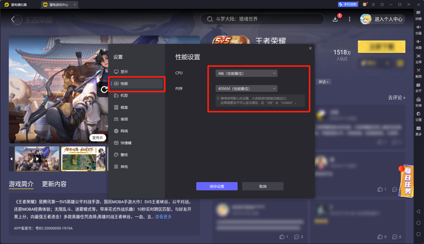 2.打开模拟器后进入设置中心,性能设置是关键,中高配置电脑建议将 CPU 调至 4 核、内存分配 4G,低端电脑可设为 2 核 2G,平衡流畅度与资源占用。