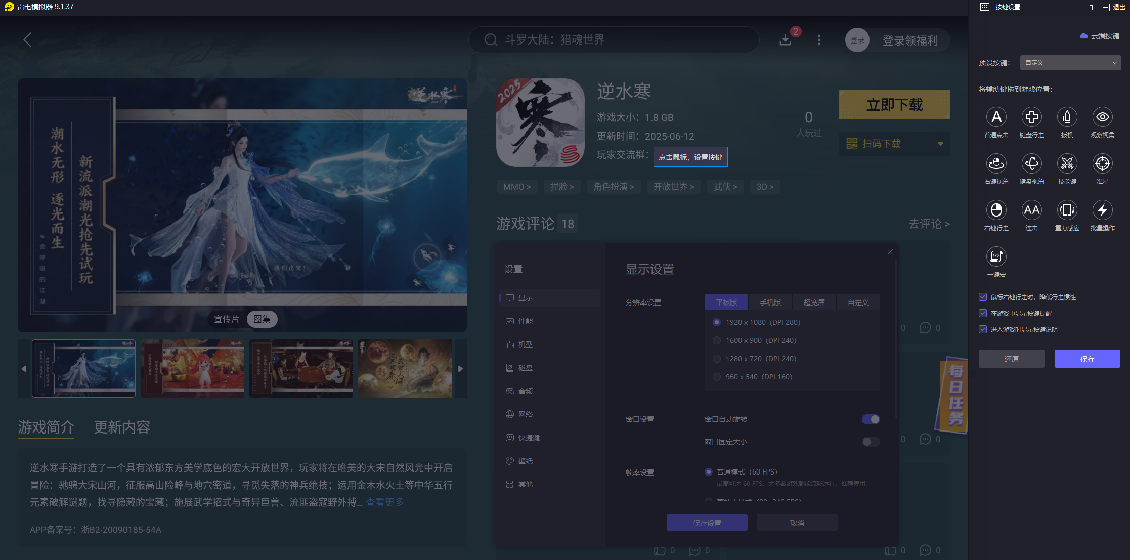 键鼠操作:对于MMORPG大作逆水寒手游,雷电模拟器的键位映射功能让复杂的手机操作变得简单直观。玩家可以自定义技能快捷键,实现精准连招释放。模拟器还针对游戏进行了特别优化,在大规模帮派战时依然能保持稳定帧率。一键宏功能还能录制常用轻功连招,让江湖探索更加轻松自如。
