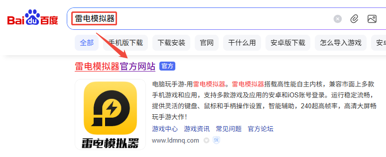 在浏览器搜索雷电模拟器,点击带官方标识的官网进入,并下载雷电模拟器。