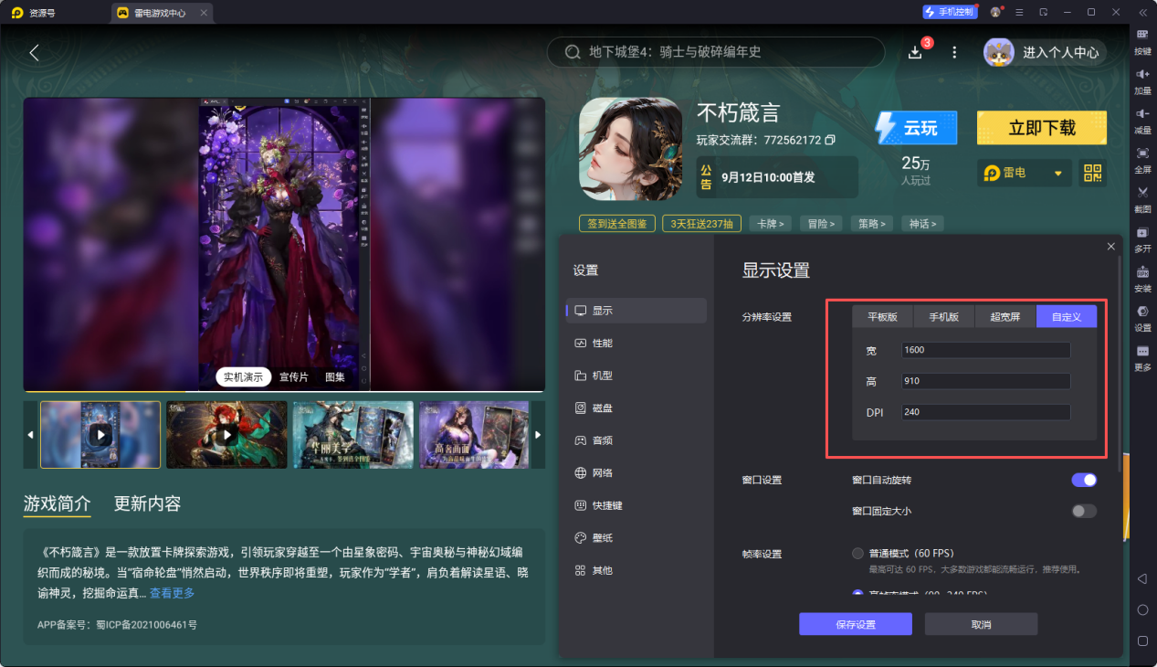 不朽箴言作为一款策略卡牌游戏,融合了深度的战术组合和精美的艺术表现。在雷电模拟器上运行,不仅可以通过键鼠精准、快速地完成卡牌选择与组合操作,更能开启高帧率模式,使卡牌特效展示和战斗动画如丝般流畅。大屏幕全面呈现卡面细节和战场局势,助你清晰洞悉战局,把握最佳出手时机,享受真正的策略对决乐趣。