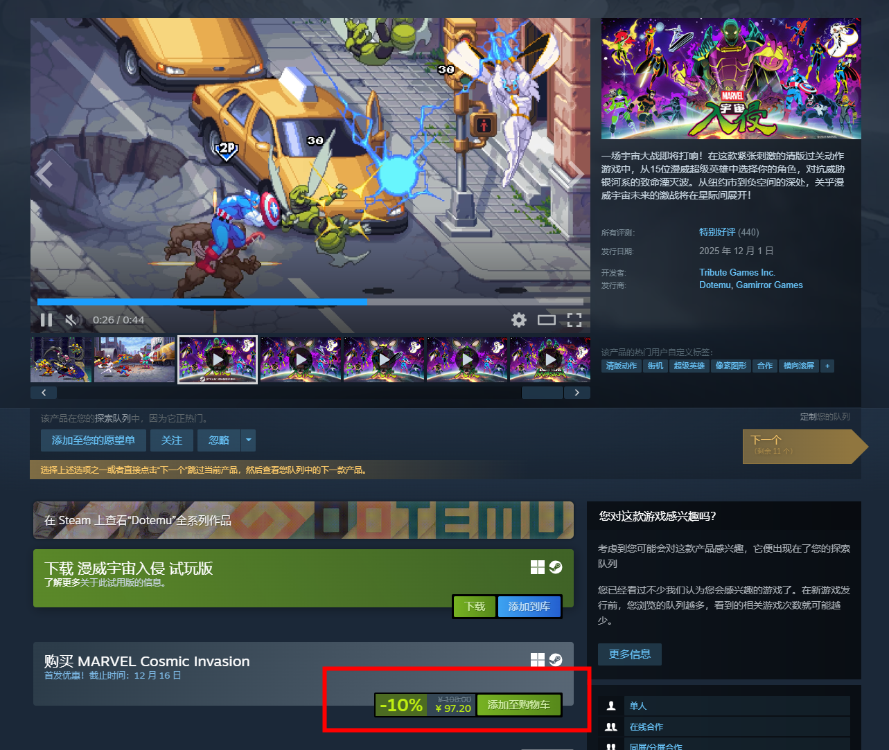《漫威宇宙入侵》目前在Steam平台正处于首发优惠期。原价108元,现在仅需97.2元即可入手,优惠截止日期是12月16日。这个价格对于一款支持在线/本地多人、拥有15位英雄和丰富组队系统的正版漫威游戏来说,性价比相当高了。如果你想体验这场复古炫酷的银河守卫战,现在就是最好的入手时机。