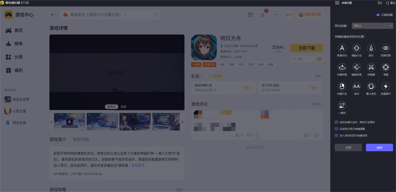 雷电模拟器的按键适配覆盖广,绝大部分游戏有预设方案,还能自定义宏命令,操作调整简单易懂。