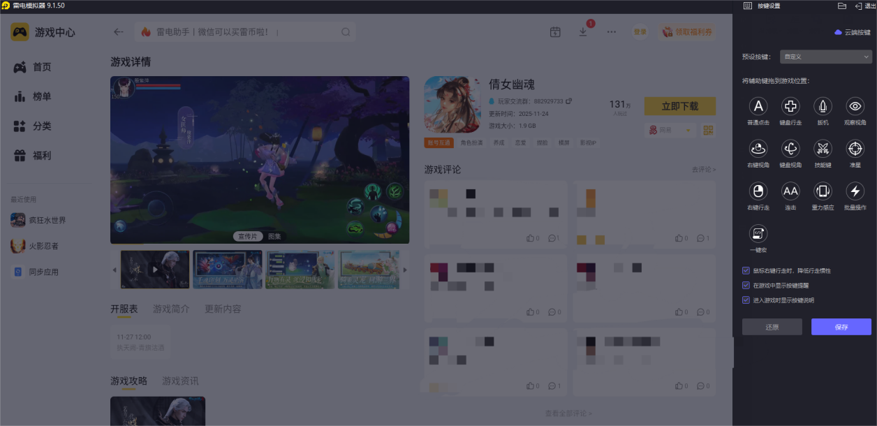 2.双击安装包后,选快速安装或者自定义安装路径,等待一两分钟就能装完,桌面会出现图标。启动模拟器后打开雷电游戏中心,直接搜倩女幽魂,点击下载安装就行,要是有渠道服需求,还能在菜单里选择对应版本。首次启动加载完成后,就能直接登录账号开始玩,键位也已经默认适配好了。