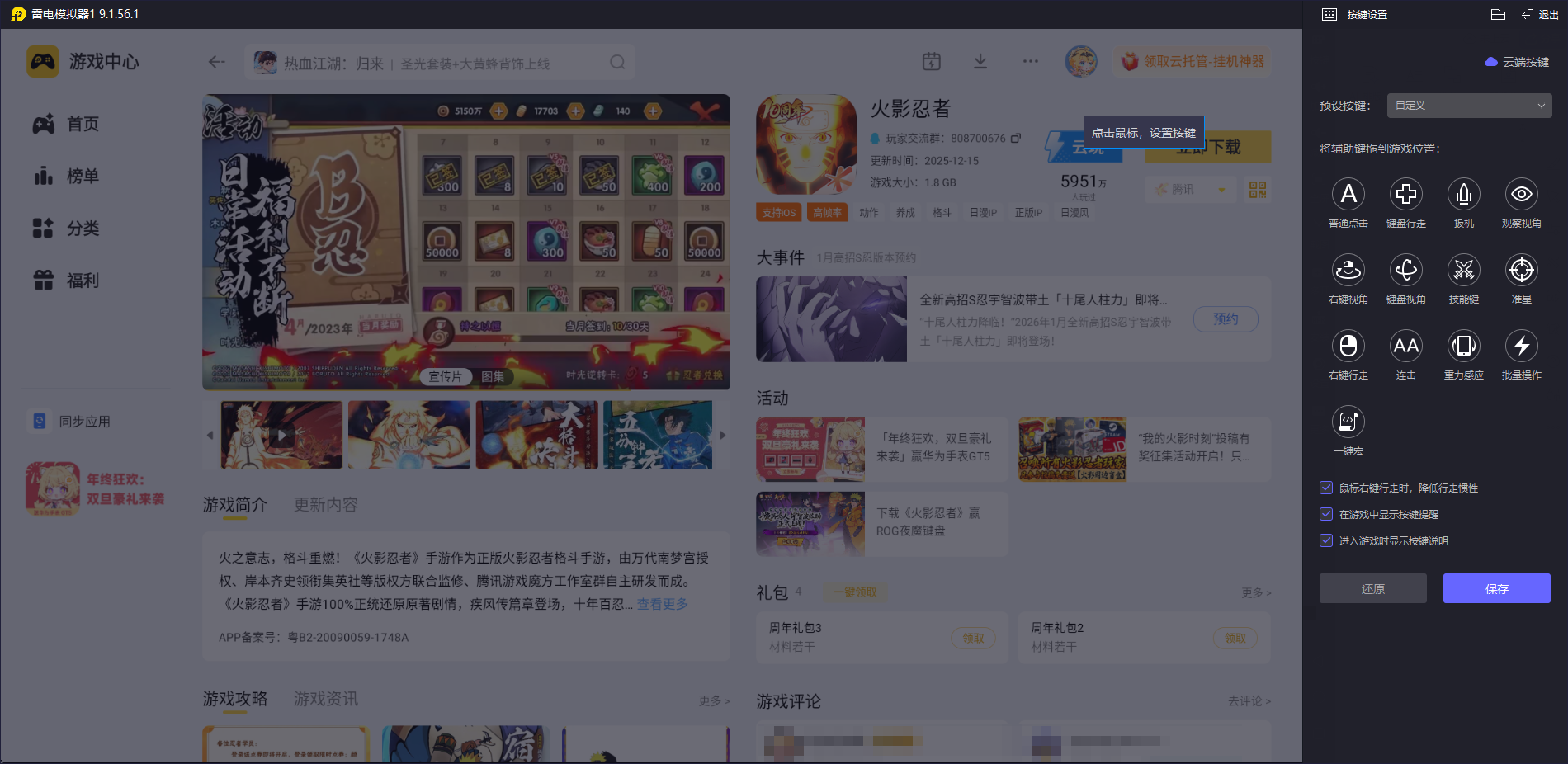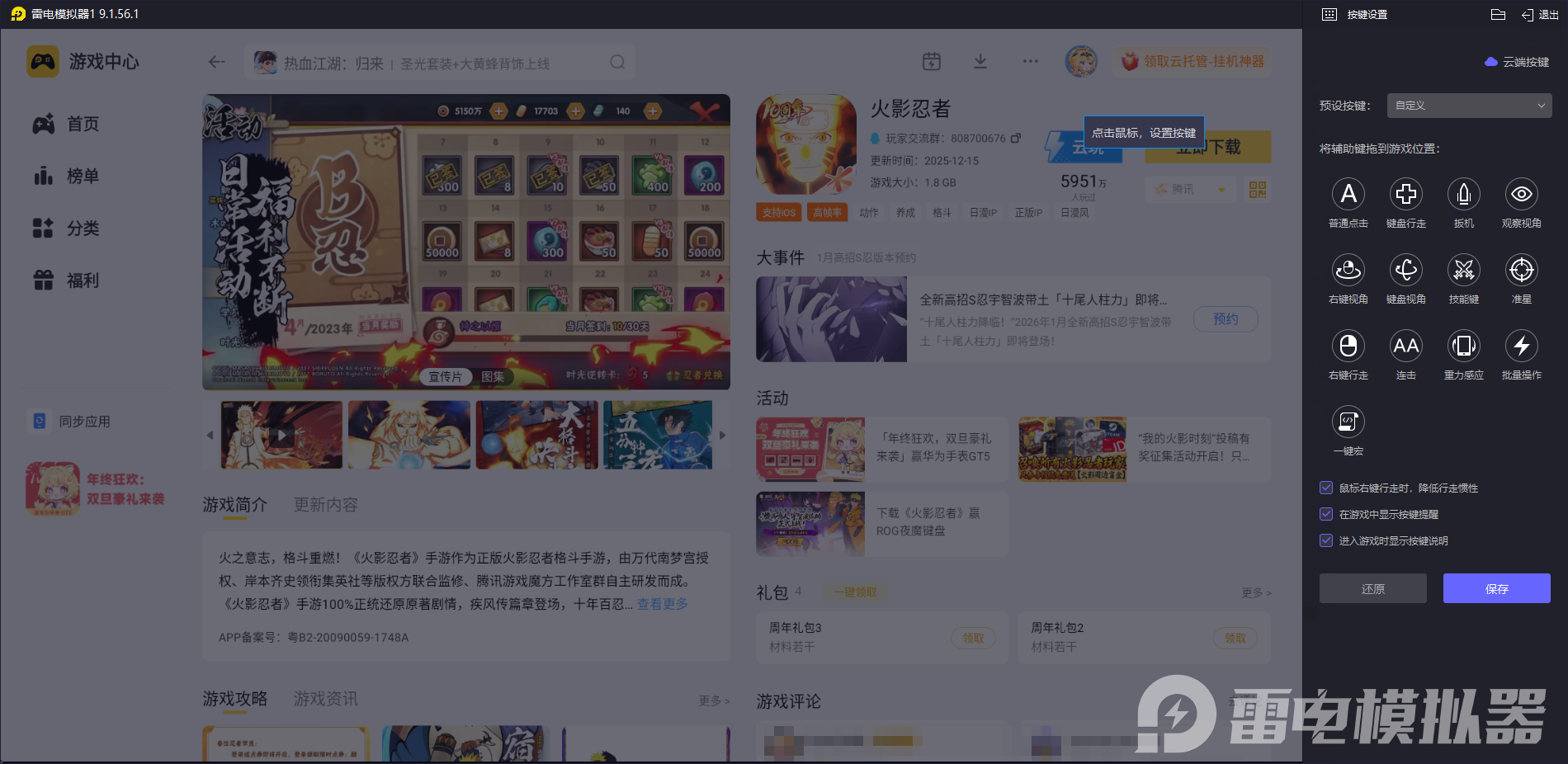 操作精准更跟手 雷电模拟器的键鼠映射功能十分实用,支持可视化自定义设置。运行火影忍者手游后,系统会自动匹配预设键位,比如将普通攻击绑定鼠标左键,忍术、奥义分配到数字键,闪避设为空格键。如果默认布局不适应,还能拖拽按键图标调整位置,复杂连招也能设置一键宏触发。相比手机触屏,键鼠操作响应更快,走位更精准,竞技场对战中能轻松避开技能,大幅提升胜率。