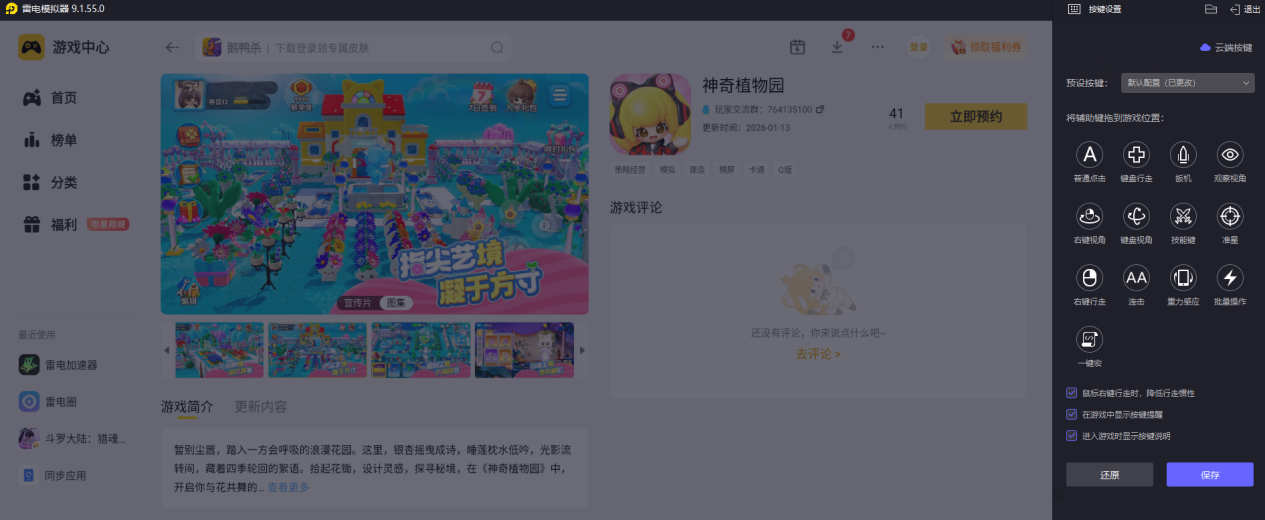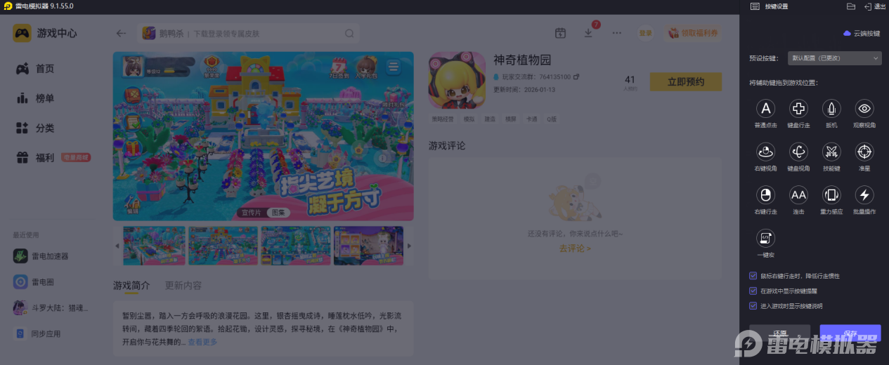 游戏中选种、控光、调湿等操作需要频繁点击,自由造景时还得精准拖拽装饰。雷电模拟器支持键盘映射和鼠标控制,能把手机触屏操作改成鼠标点击、键盘快捷键,点击位置更准确,拖拽布置时也更顺滑,长时间培育植物也不会觉得手酸,比手机操作更省力。
