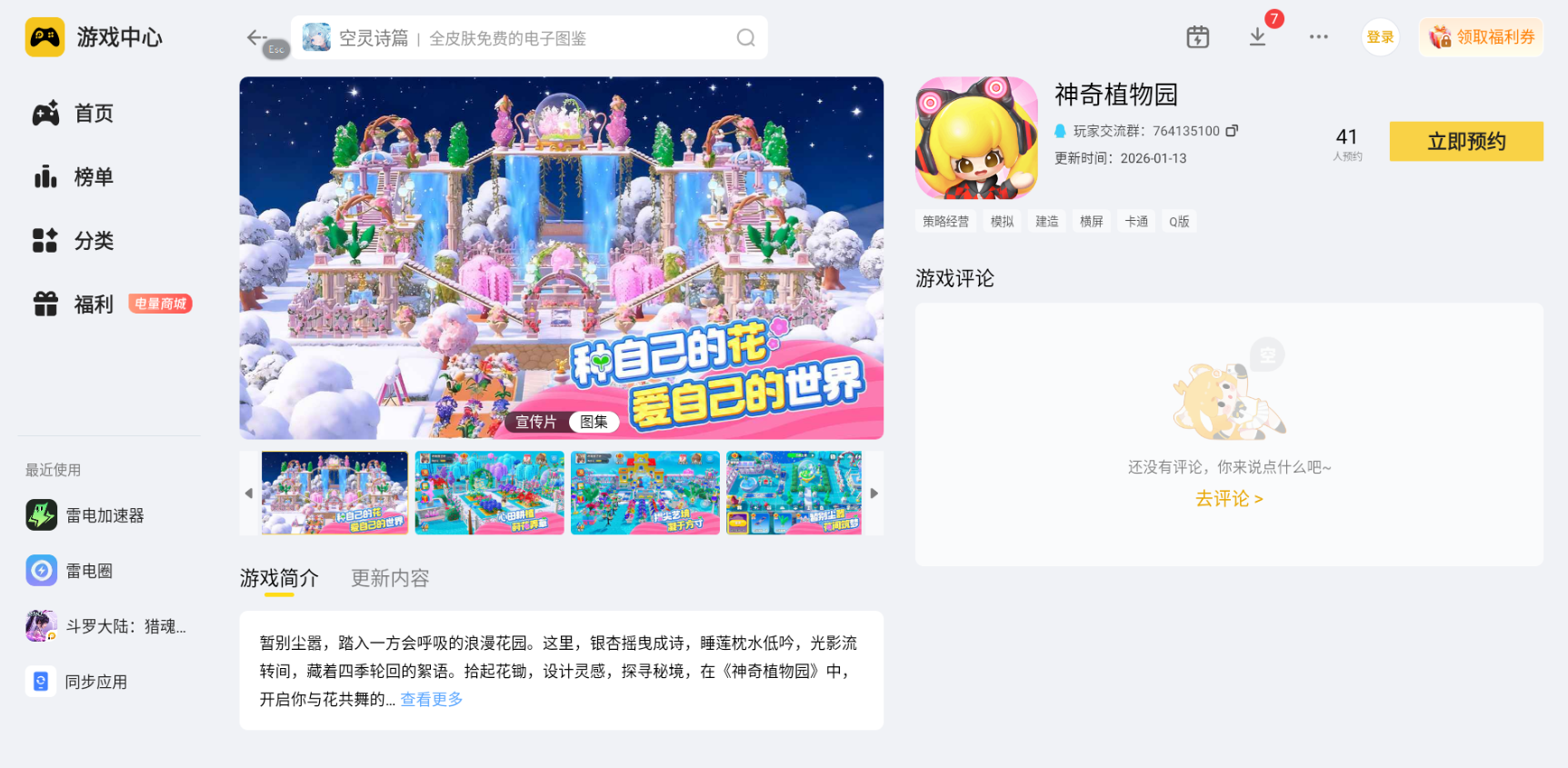 在这里小编建议大家用雷电模拟器,是玩《神奇植物园》手游的优质选择,尤其在操作和画面两方面能大幅提升体验,让园艺过程更舒心。大家可以通过官网下载雷电模拟器,然后在雷电游戏中心中搜索该游戏预约即可。这款游戏主打休闲培育与自由造景,玩家能栽种多样植物,观察它们发芽、开花的完整过程,还能自由搭配花盆、装饰打造专属花园。操作上需要精准点击浇水、修枝,拖拽布置景观;画面风格清新细腻,有昼夜更替、光影变化等细节,整体治愈又耐看。