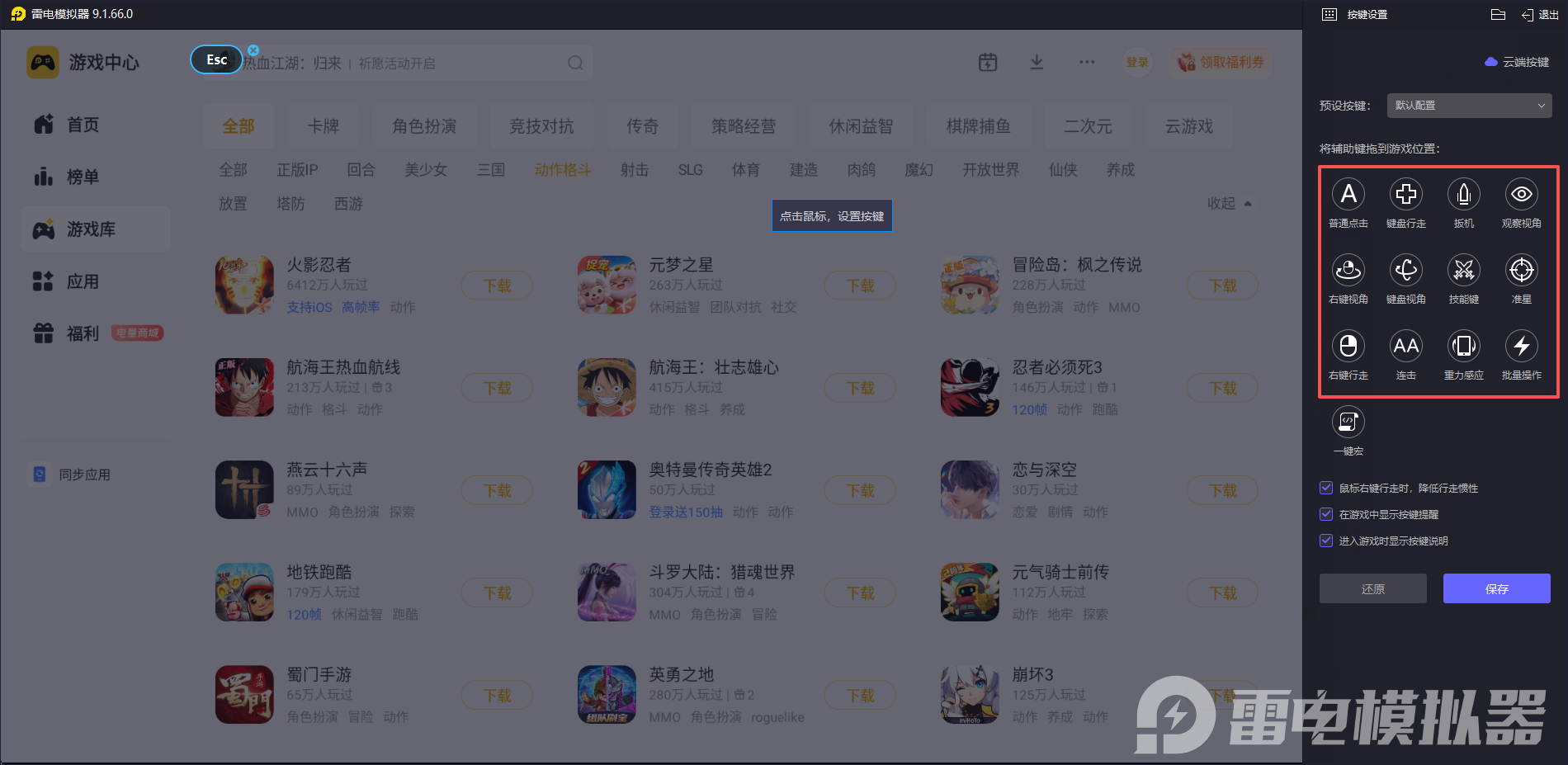操作体验,智能高效 在操作方面,雷电模拟器提供了强大的键鼠映射功能,内置了覆盖95%以上热门游戏的预设键位方案,例如在火影忍者中可以实现快速连招操作,极大提升了操作效率和精准度。