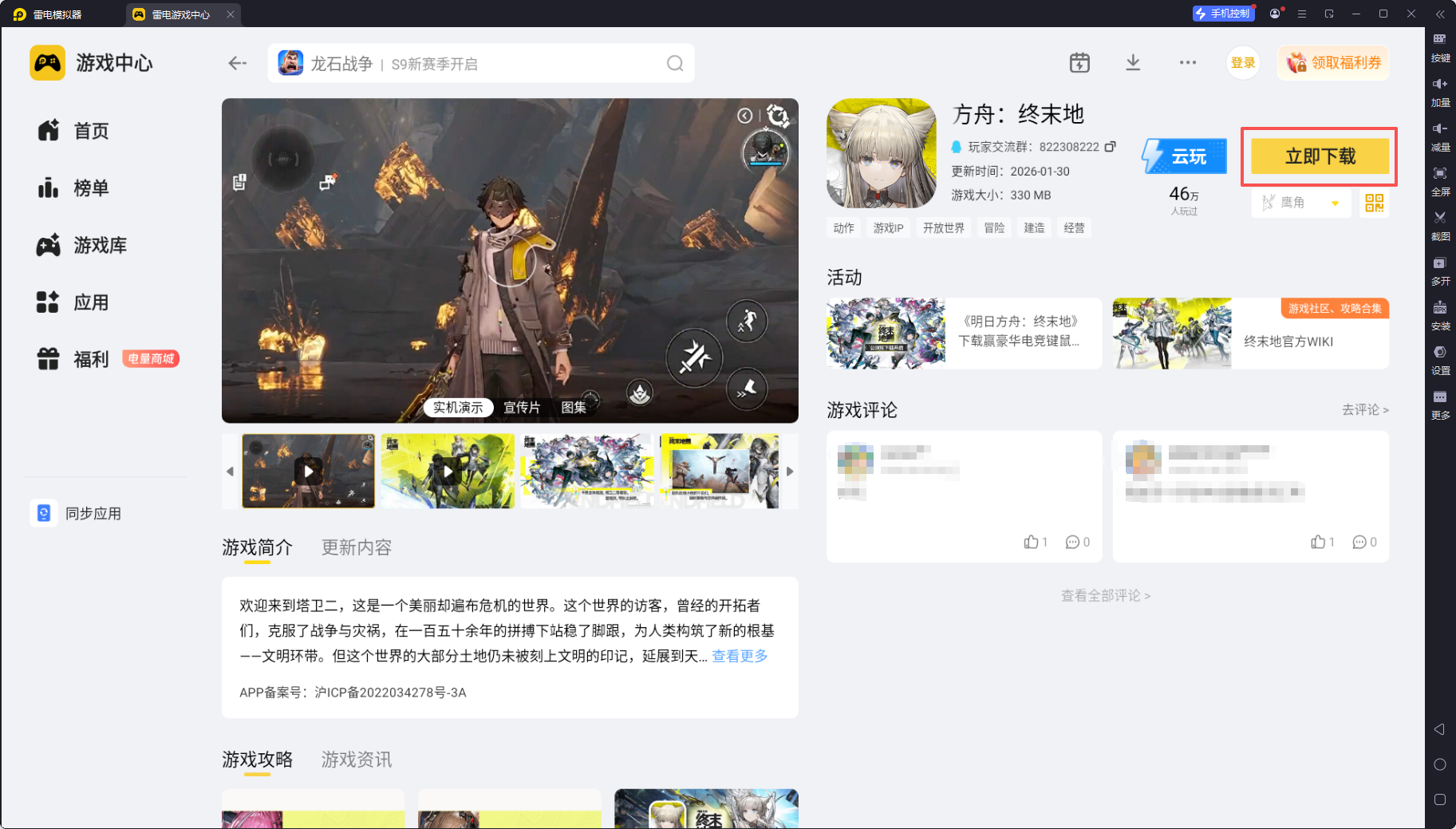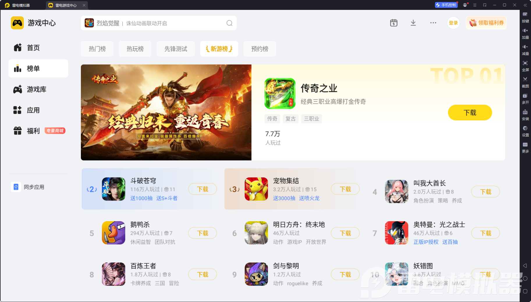 打开模拟器主界面后,直接进入内置的“雷电游戏中心”搜索你想玩的游戏,点击下载按钮即可自动安装。
