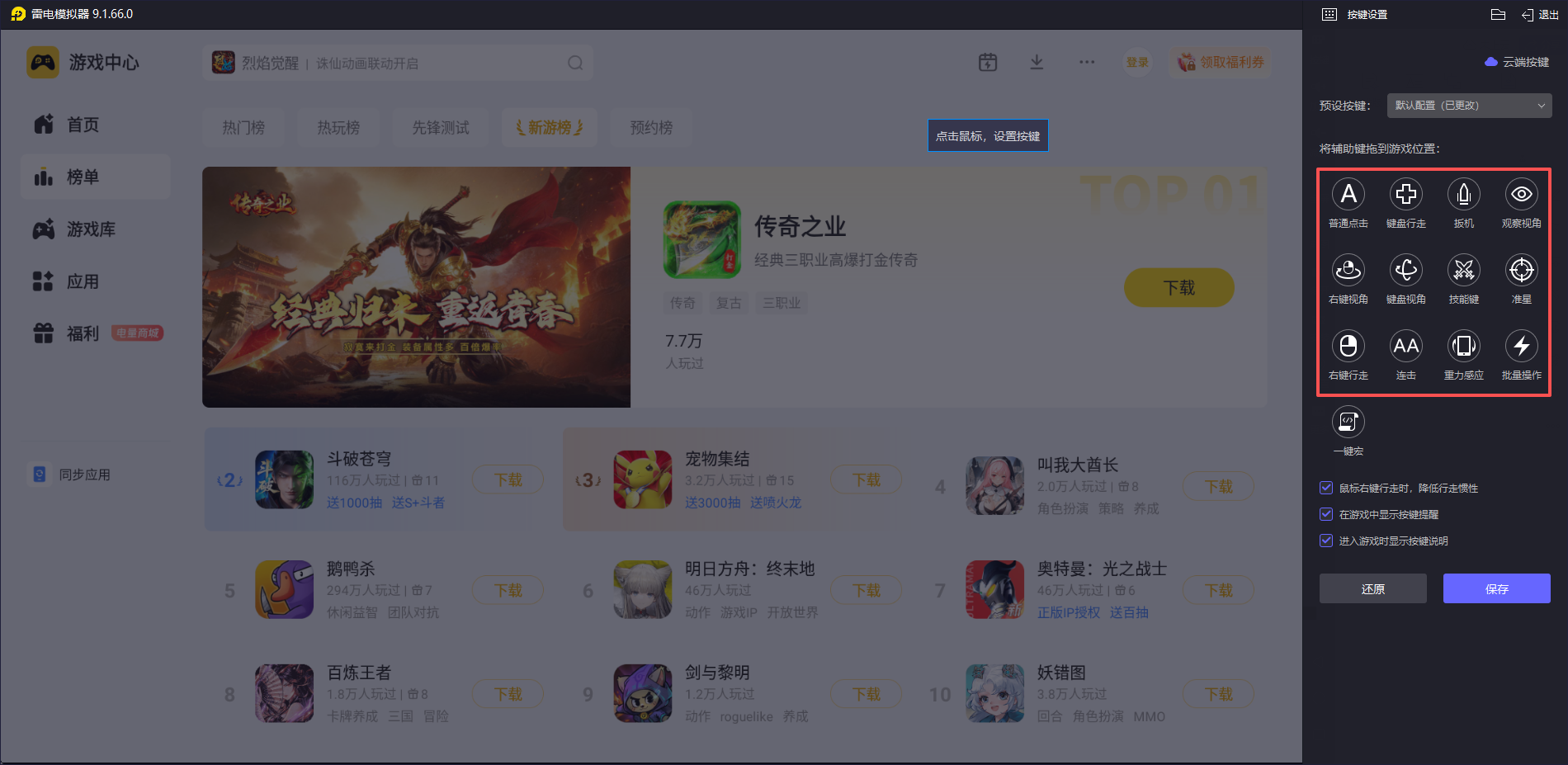 雷电模拟器最大的优势之一,就是将手游的触屏操作转化为更符合PC用户习惯的键鼠操作,实现了精度与效率的飞跃。雷电模拟器为绝大部分主流游戏提供了预设的键位方案,覆盖率达95%,让玩家无需复杂设置即可上手。更重要的是,它支持深度自定义。你可以将角色移动设置为熟悉的WASD键,将技能释放、道具使用等绑定到鼠标侧键或键盘特定按键上,更适合你的操作习惯。