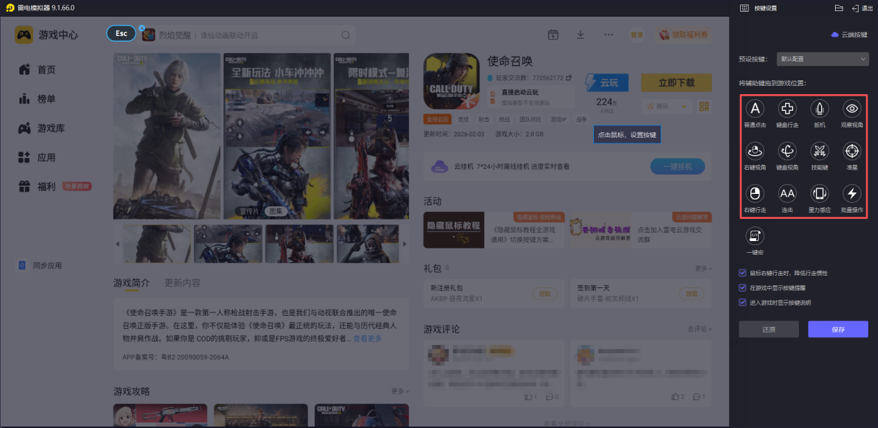 第二步启动模拟器后进入内置"雷电游戏中心",搜索"使命召唤手游"直接下载安装。