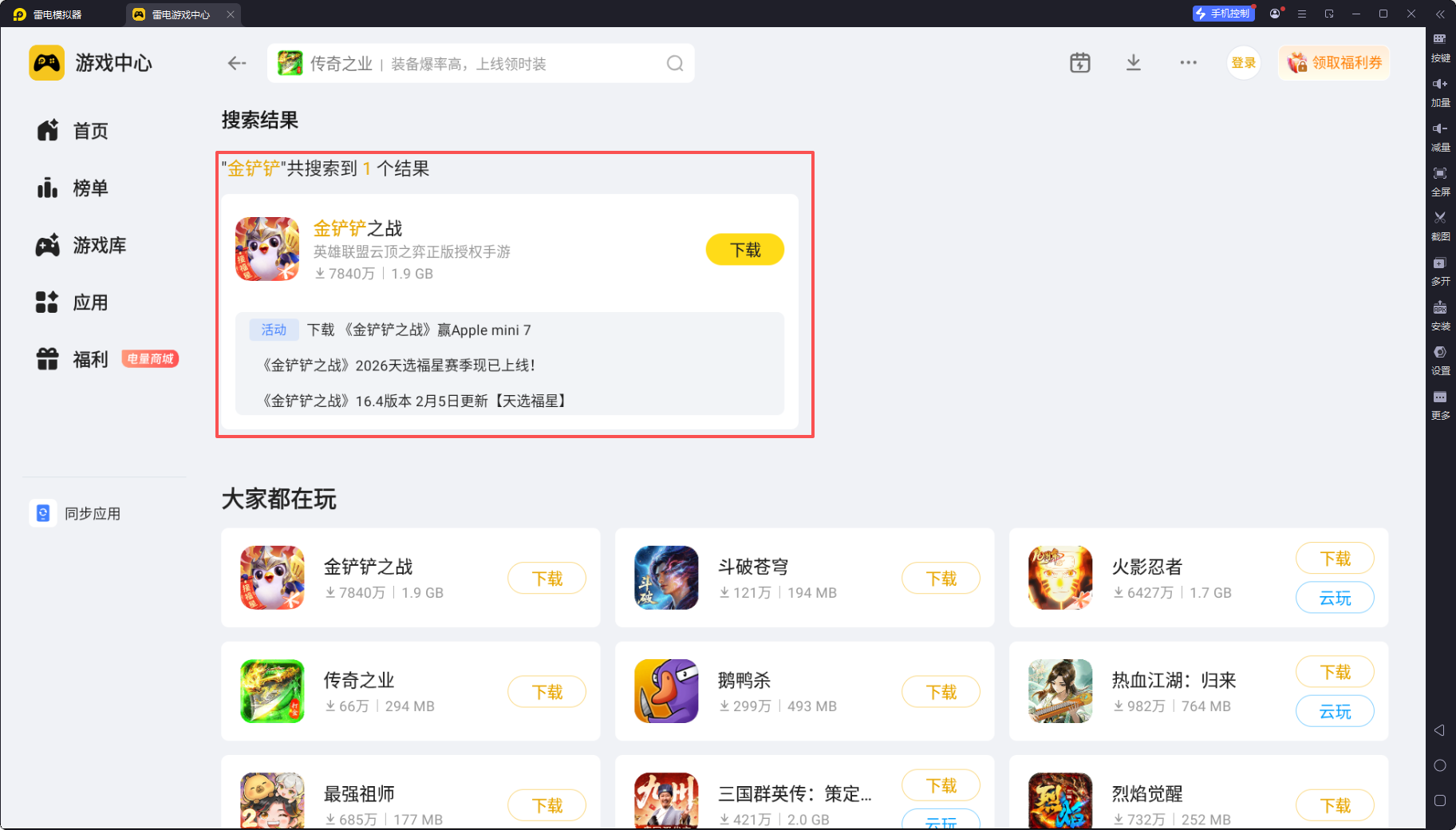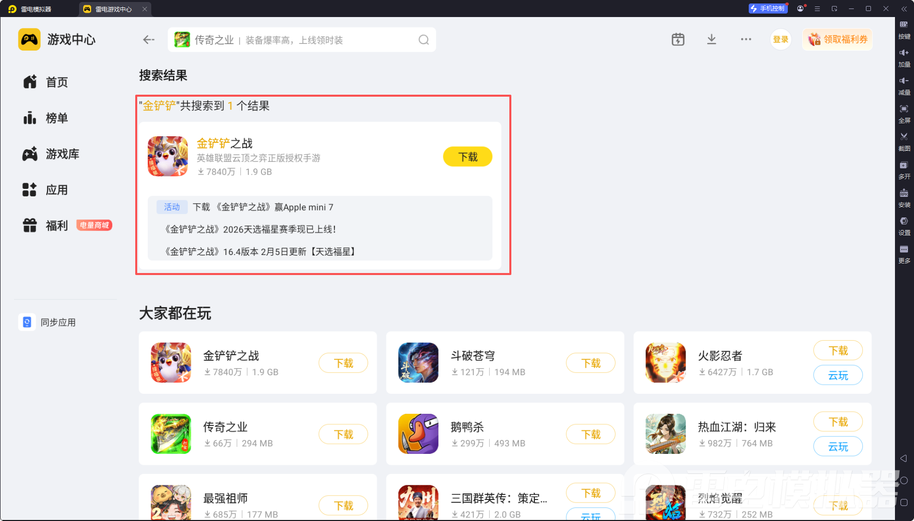 在雷电模拟器上打开内置的游戏中心,搜索你想要玩的手机游戏,点击下载,等待完成,你就可以在电脑上玩手机游戏了。