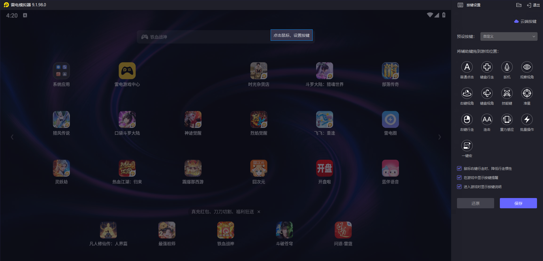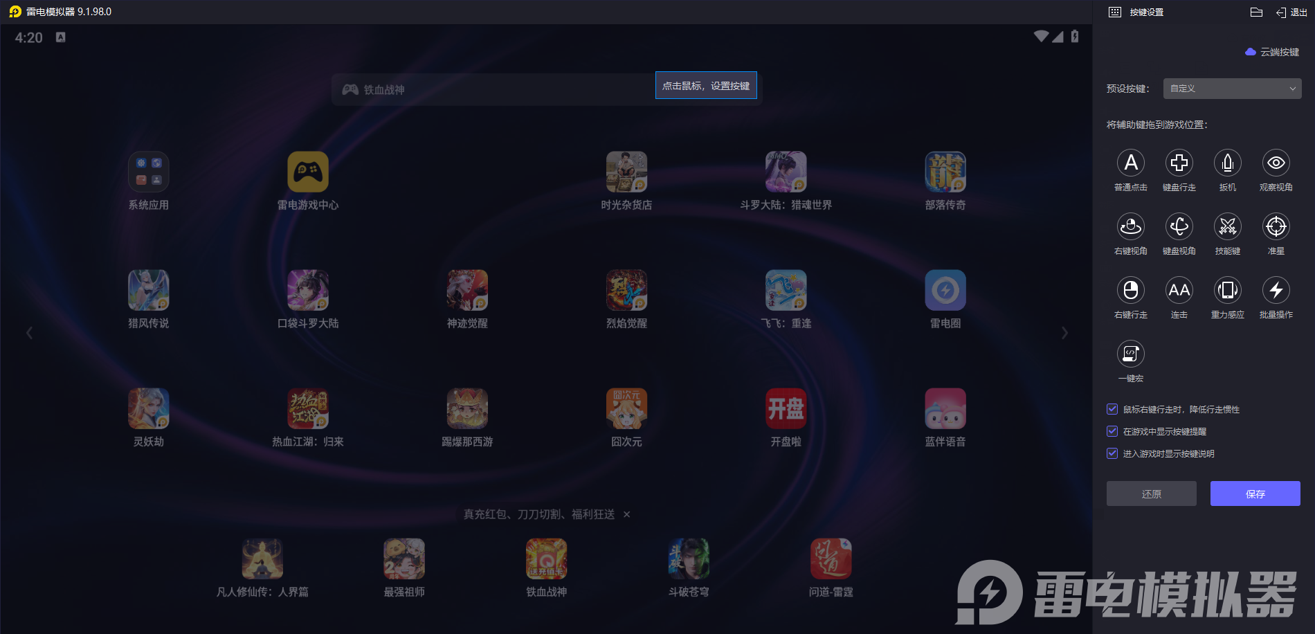 雷电模拟器在操作上的优势,是很多玩家选择它的核心原因。它内置了超过300款热门游戏的预设键位,打开游戏就能直接用键鼠操作,不用自己手动设置。对于喜欢自定义的玩家,它的可视化键位编辑界面很简单,拖动按键就能调整位置,还能设置组合键和宏命令,把复杂的连招或重复操作简化成一键触发。