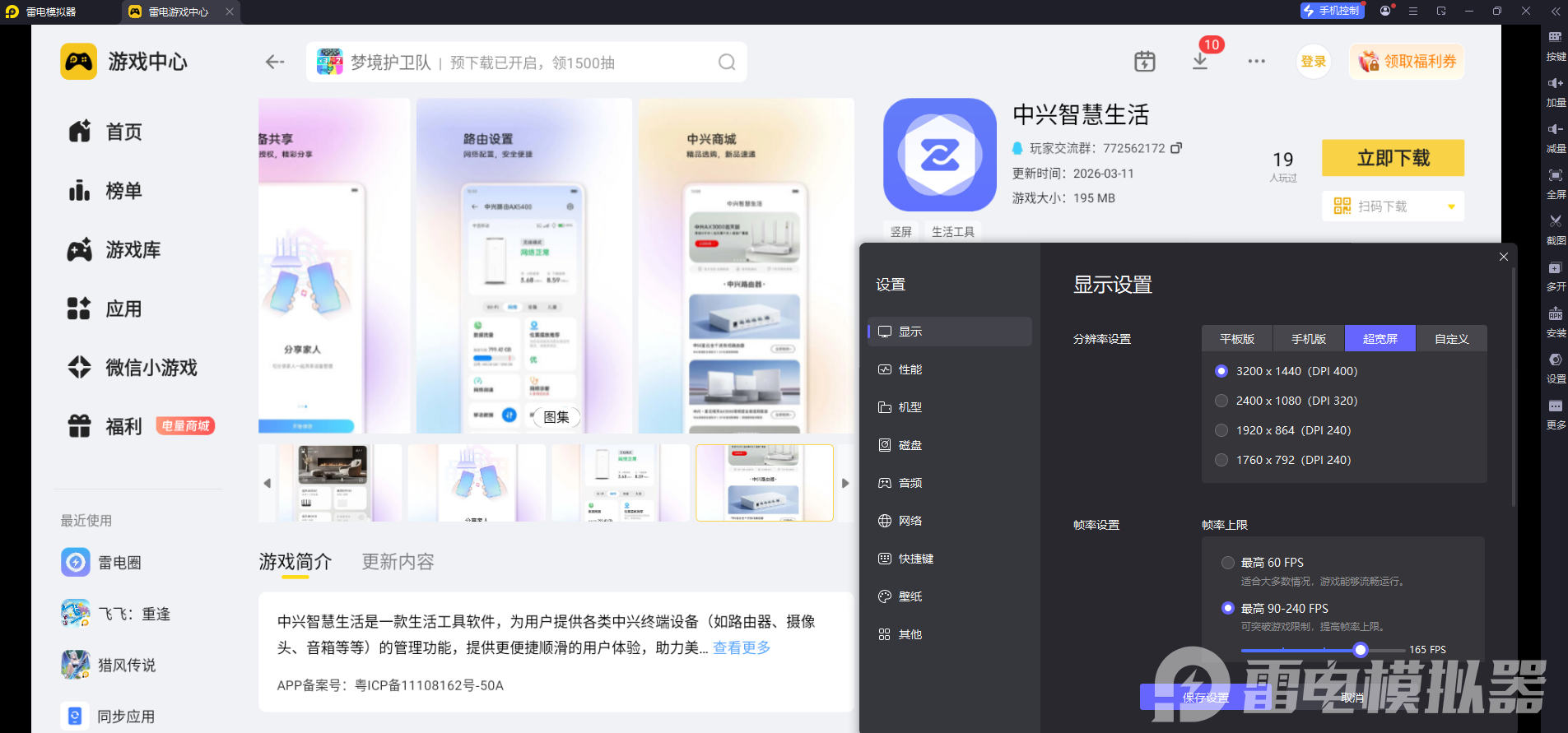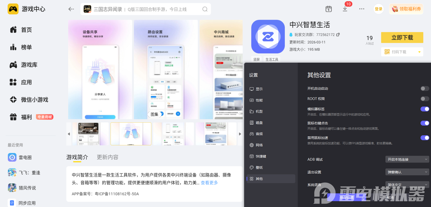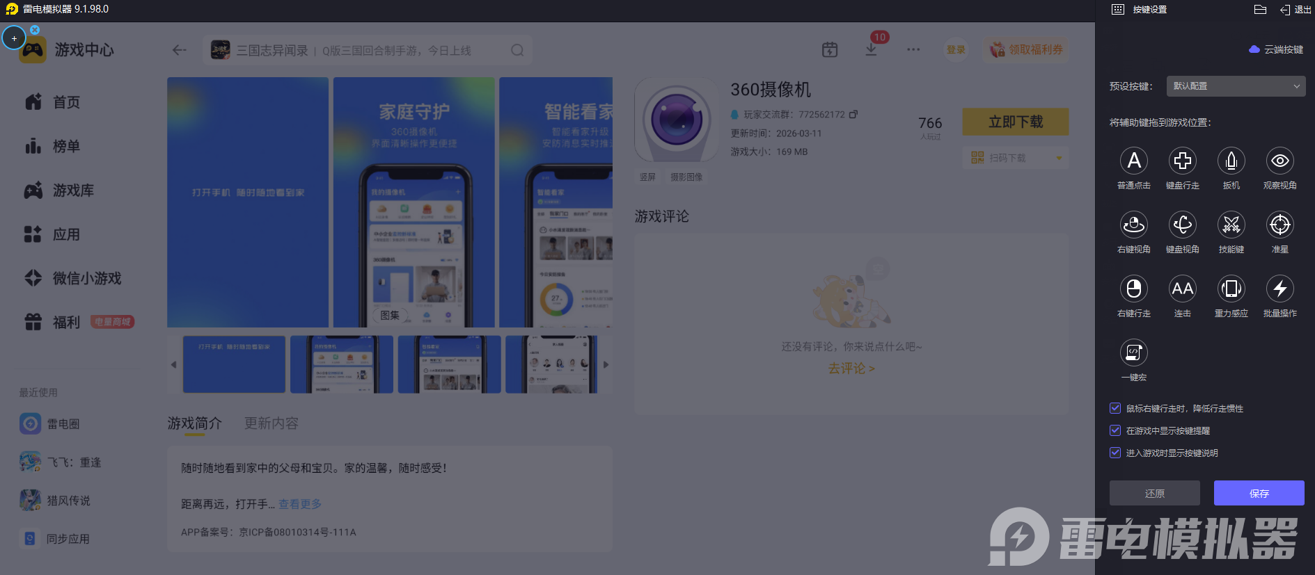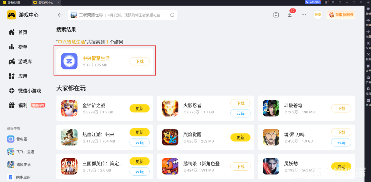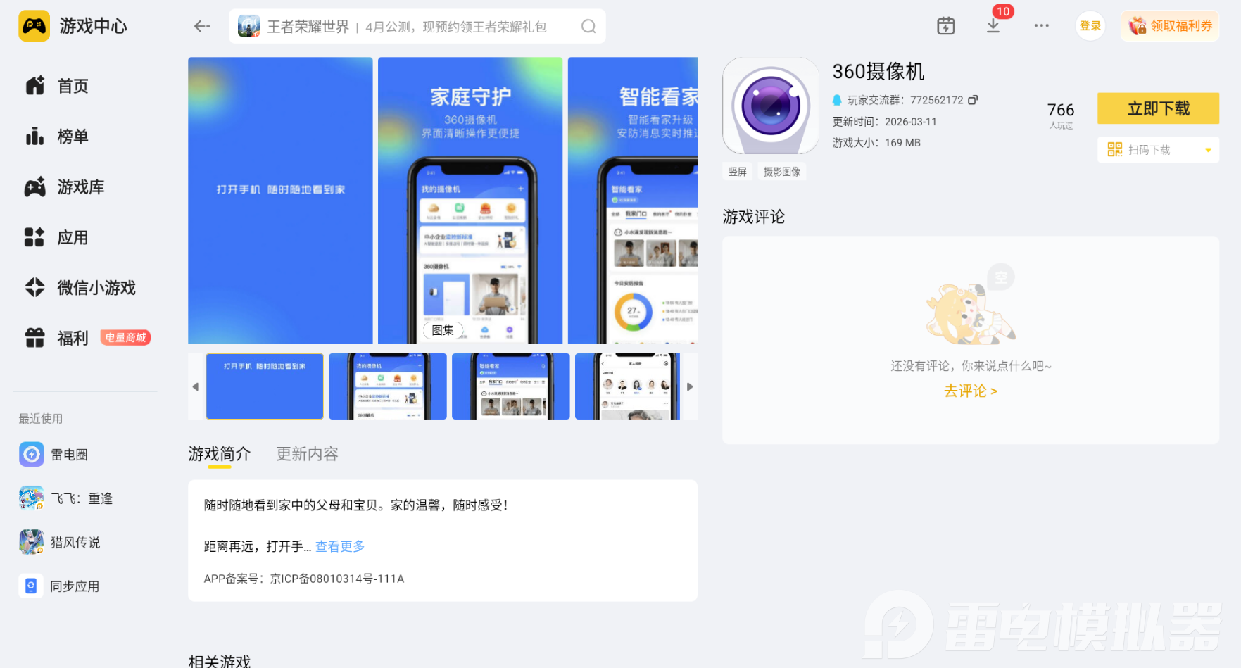 想要简单又省心地在电脑上看监控,小编推荐大家使用雷电模拟器。它可以在电脑上稳定运行手机版的监控应用,不管是360摄像机APP,还是中兴智慧生活APP,都能直接在模拟器的雷电游戏中心里搜索安装,不用费心找专门的电脑客户端,前期准备工作特别轻松。