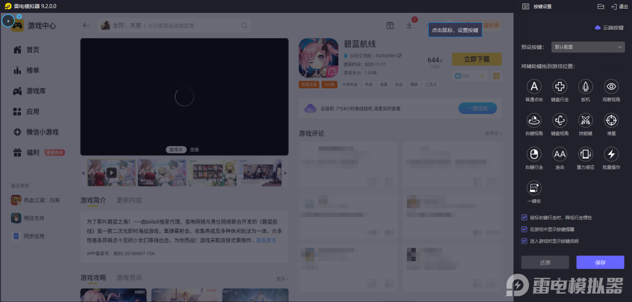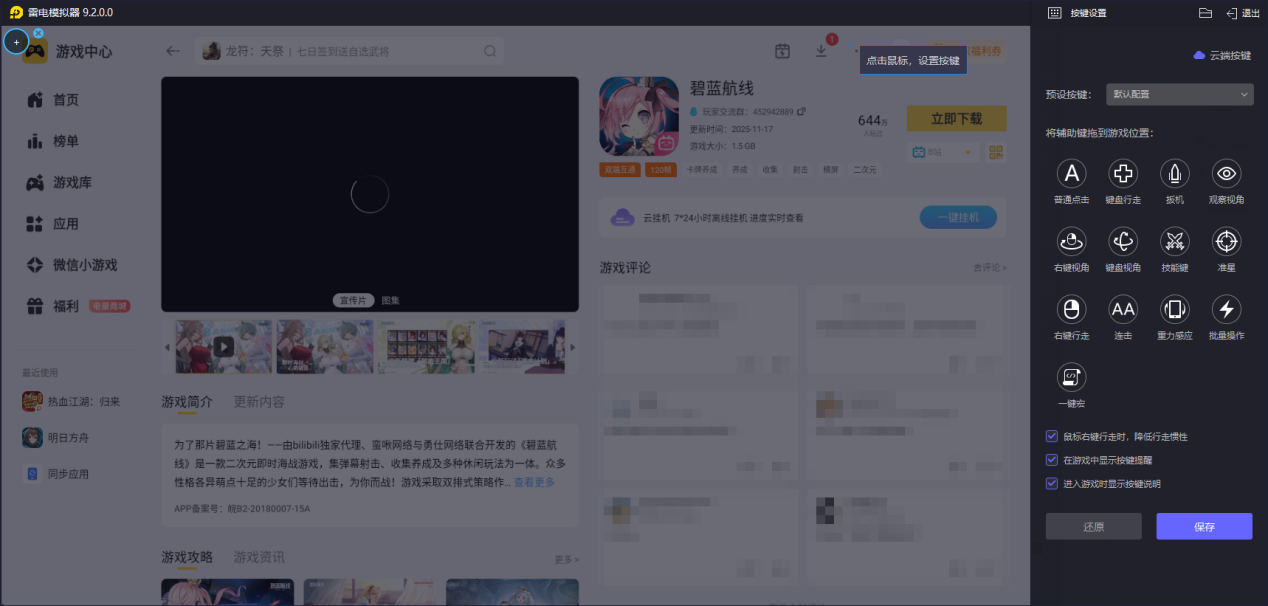 在操作上,它的键鼠适配也十分精准,玩碧蓝航线时,WASD 键控制舰船移动更灵活,能快速微调位置躲避弹幕,还能把主炮、技能等功能绑定到按键上,响应延迟低,连招丝滑,告别触屏误触。