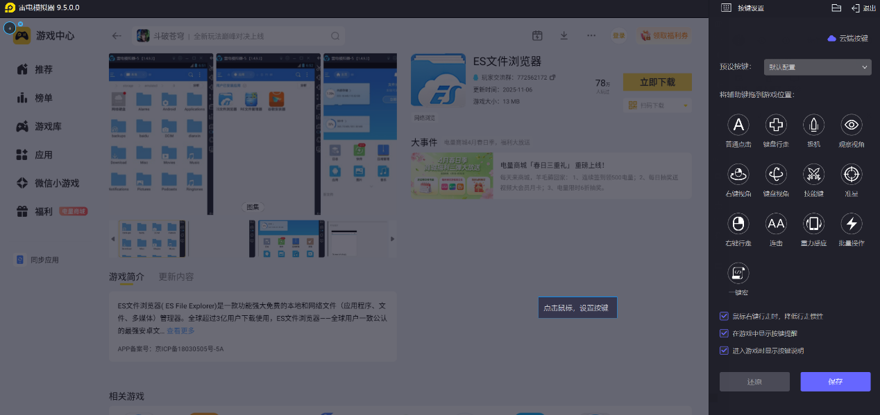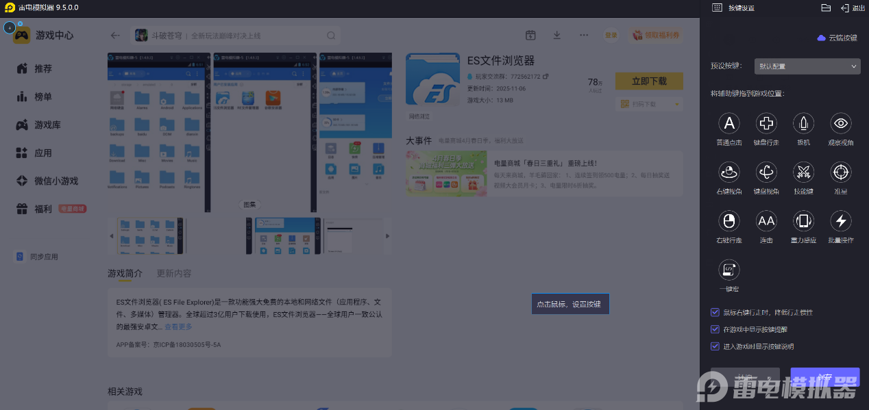雷电模拟器以稳定的运行环境与实用的功能设计,为ES文件浏览器电脑版提供了优质运行载体。开阔的显示效果、精准的键鼠操控搭配专业的文件管理能力,让电脑端安卓文件处理更高效。无论是日常整理文件,还是搭配应用使用,都能获得流畅稳定的体验。