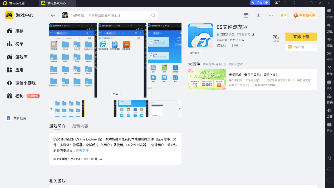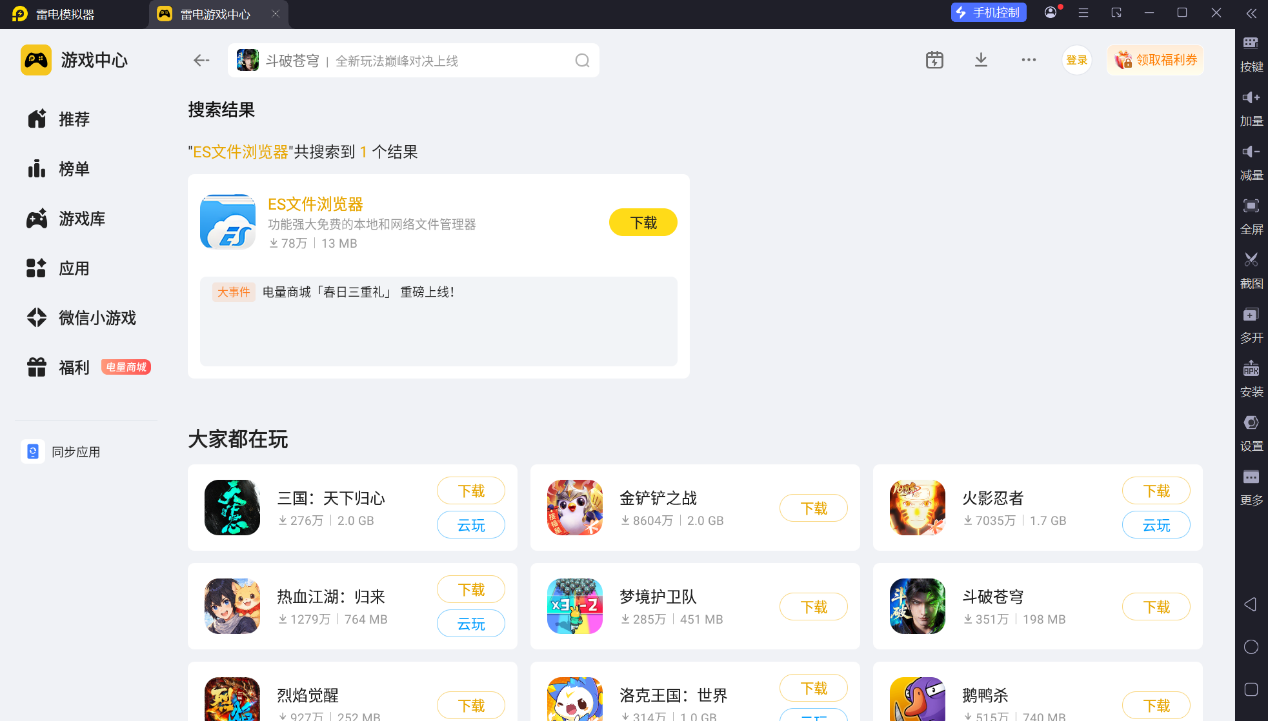 PC端管理安卓文件时,很多用户需要稳定易用的ES文件浏览器电脑版,想要流畅运行这款工具,推荐选择雷电模拟器来使用ES文件浏览器电脑版。该模拟器对安卓文件管理工具适配完善,可依托电脑硬件优势,实现高效文件整理、数据传输与应用管理,兼顾操作便捷性与运行稳定性。