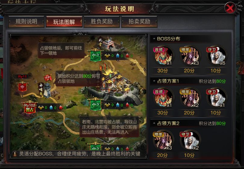 1、道路守卫:必须夺回/守护通往卧龙山庄的南/北营寨。若道路丢失,决胜场需重新打通,极大浪费21点场的资源投入。