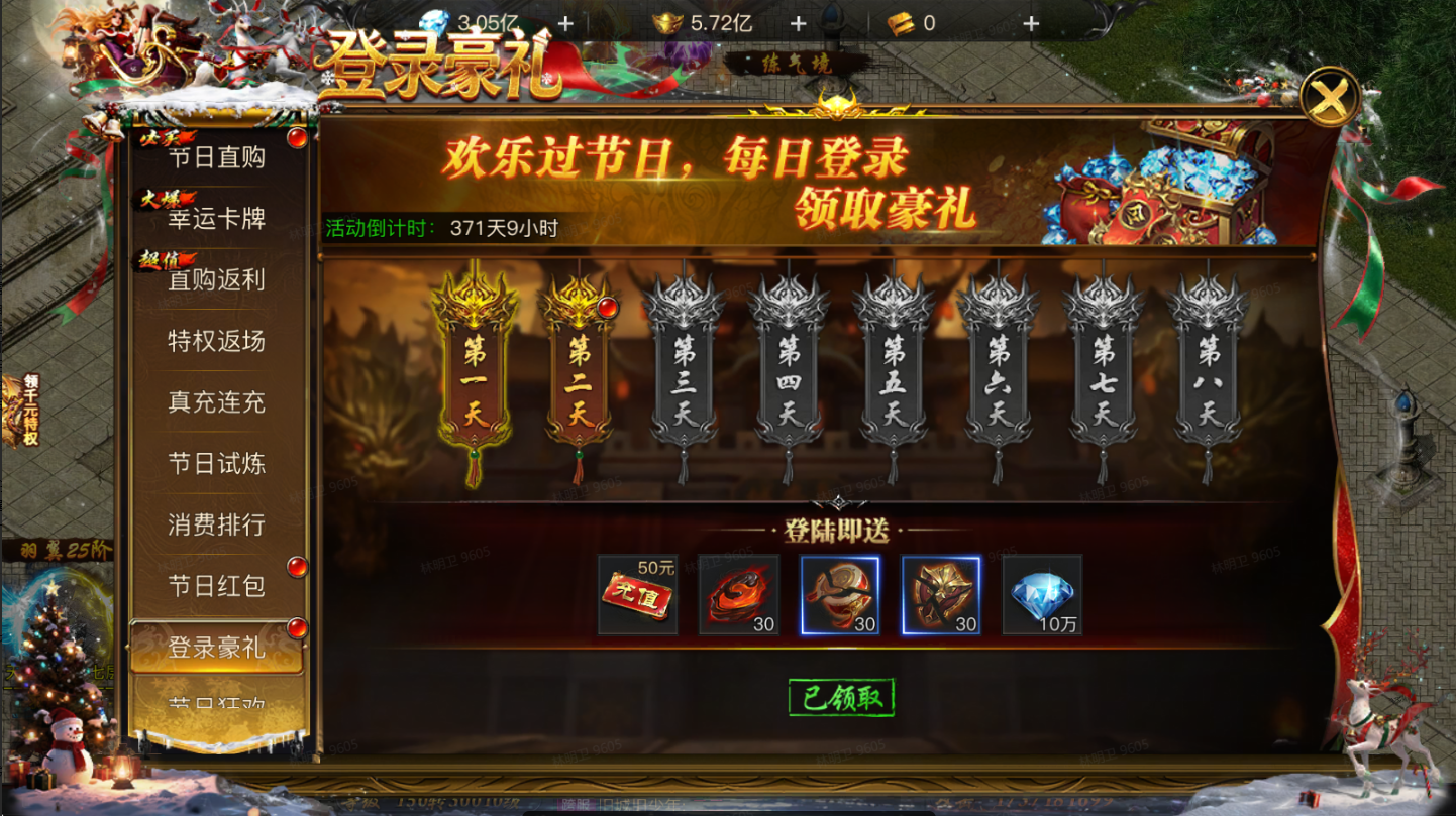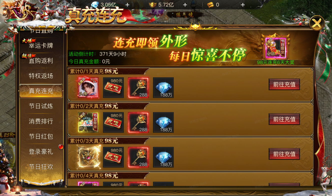 活动持续期间内,当天真充金额达到门槛则可领取对应天数的奖励,充多返多!