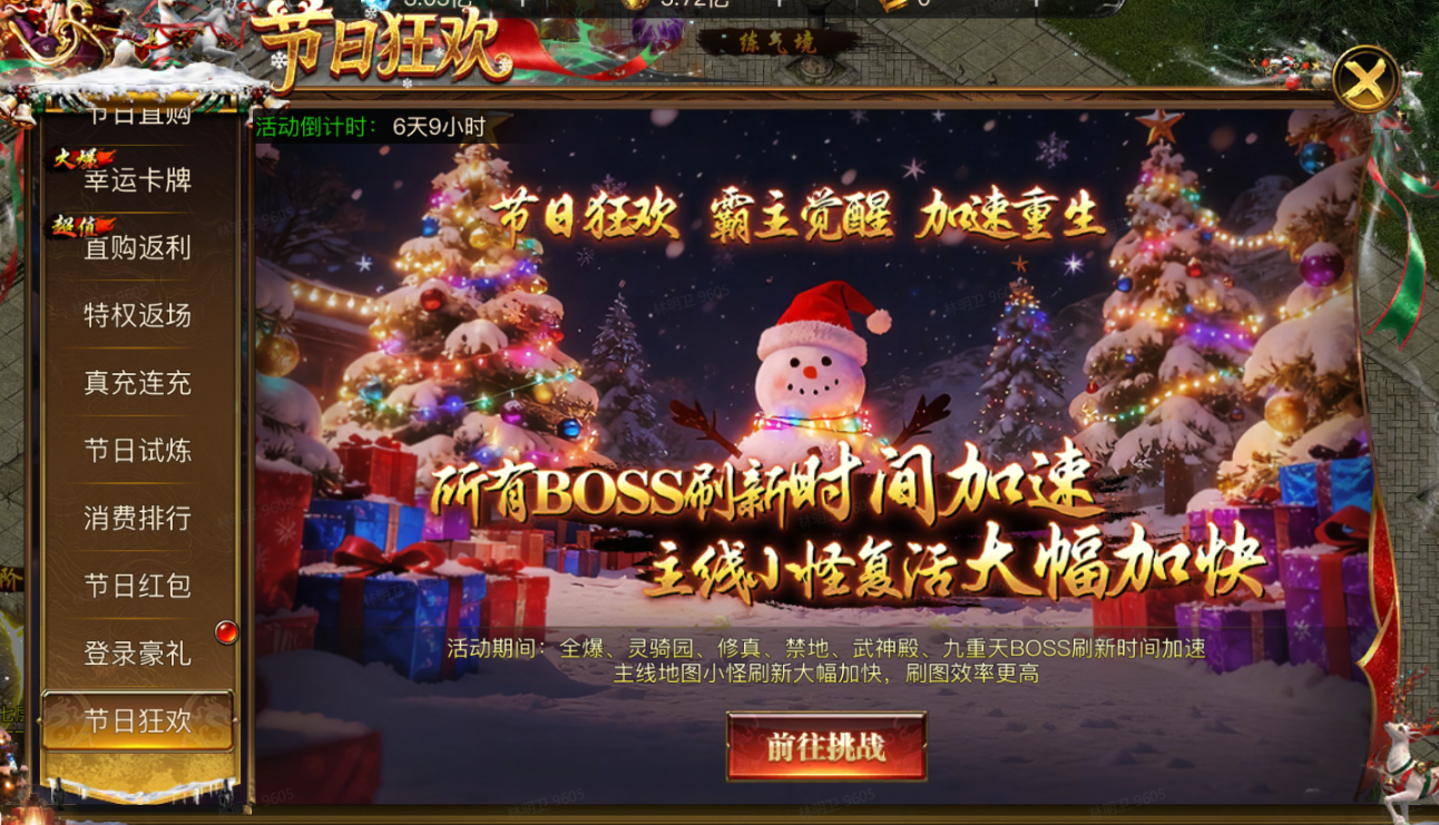 "凛冬已至,玛法大陆被漫天飞雪笼罩!但比寒风更炽热的,是即将席卷全服的圣诞狂欢!当圣诞老人的雪橇划过比奇城上空,当神秘礼物在祖玛寺庙悄然降临,勇士们,是时候提起手中的屠龙刀,迎接这场属于传奇的圣诞盛宴!"