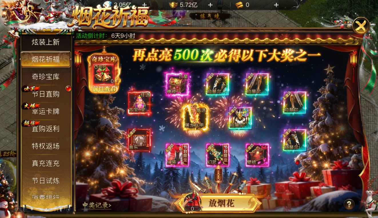 消耗节日豪礼中获取的【庆典烟花】抽奖,每抽奖500次可抽取一次大奖