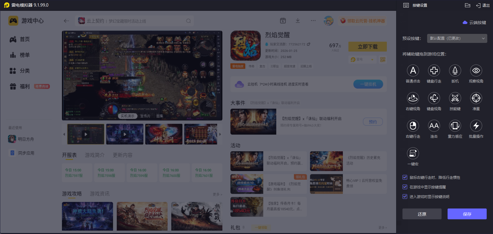 对于喜欢竞技的玩家来说,雷电模拟器的智能匹配手机端键位功能是一大福音。它可以根据烈焰觉醒的游戏操作特点,为玩家提供一套专属的键位方案。玩家无需花费大量时间去熟悉和适应键位,就能轻松上手,实现精准的操作。而且,雷电模拟器还支持自定义宏指令,玩家可以将复杂的连招简化为一键触发,大大提高了操作效率,让你在竞技场上占据优势。