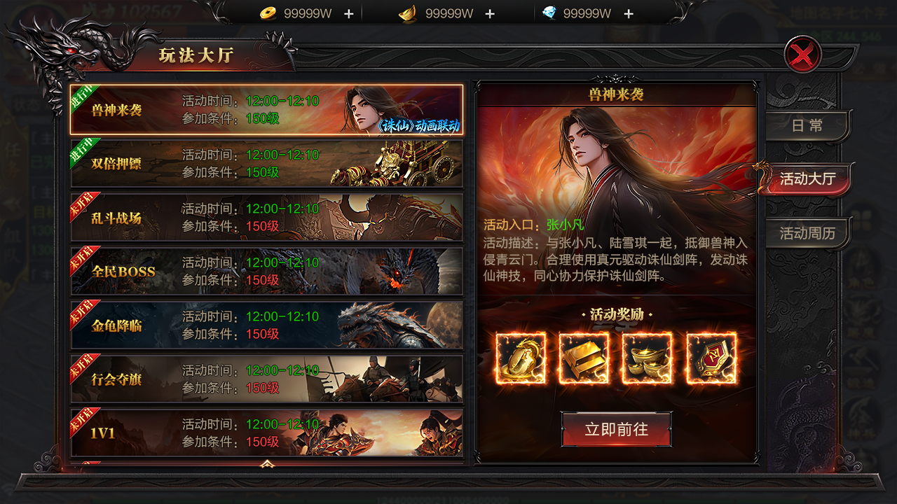跨服战场全面升级!四大灵兽--饕餮、烛龙、黄鸟、夔牛降临传奇世界。召集行会兄弟,抢先击杀灵兽,不仅全员可得丰厚奖励,同行会人数越多,奖励越豪华!参与BOSS击杀,领专属击杀珍稀奖励、更可争夺BOSS归属权,活动结束后全服拍卖行同步开启,官职令、顶级装备等你以钻石竞拍,一战成名,名利双收!