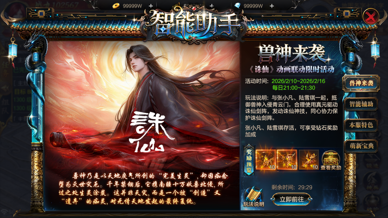 全新行会守卫战限时登场!兽神携妖魔大军强袭青云门,多波攻势全面压境。你将与张小凡、陆雪琪并肩作战,驱动诛仙剑阵,抵御汹涌兽潮!
