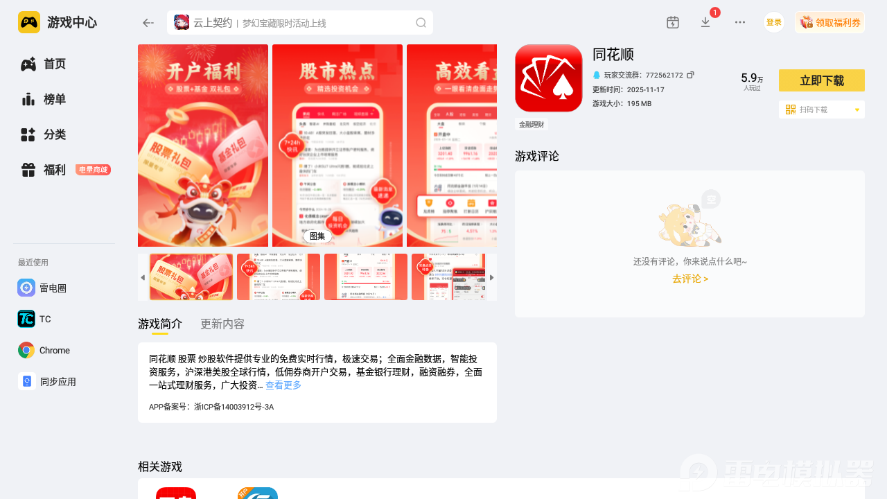 如果大家希望能让自身得到不错的体验,尤其是随时随地进行看盘,解锁各类资讯与头条动态,那么小编觉得雷电模拟器的使用就很合适,关键是足够的便利,我们只需打开浏览器搜“雷电模拟器”进入官网下载即可,在首页去点击雷电游戏中心进入,在查找同花顺就能进入到对应的专区了解详情啦。