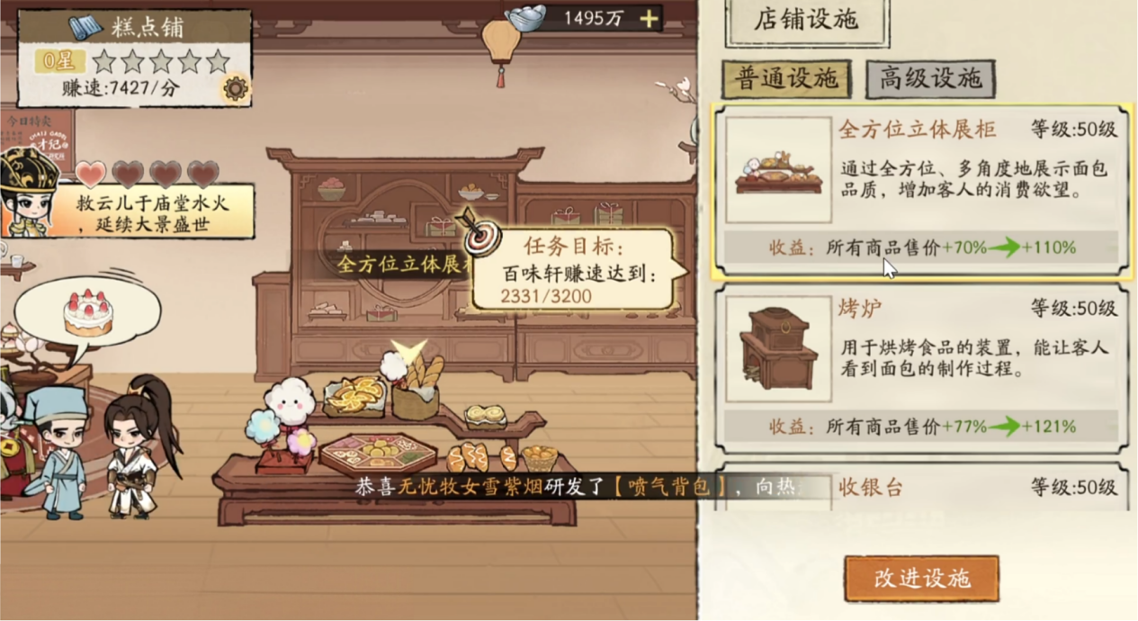 唐伯虎的派遣加成玩法是经营的核心助力,而且和其他门客搭配能发挥更大作用。他和戏园、书画坊的相性最高,把他派到这两类店铺,不仅能直接提升店铺的基础收益,还能解锁“诗画助兴”的额外效果——每小时有概率触发客人额外消费,甚至能获得稀有食材和道具。