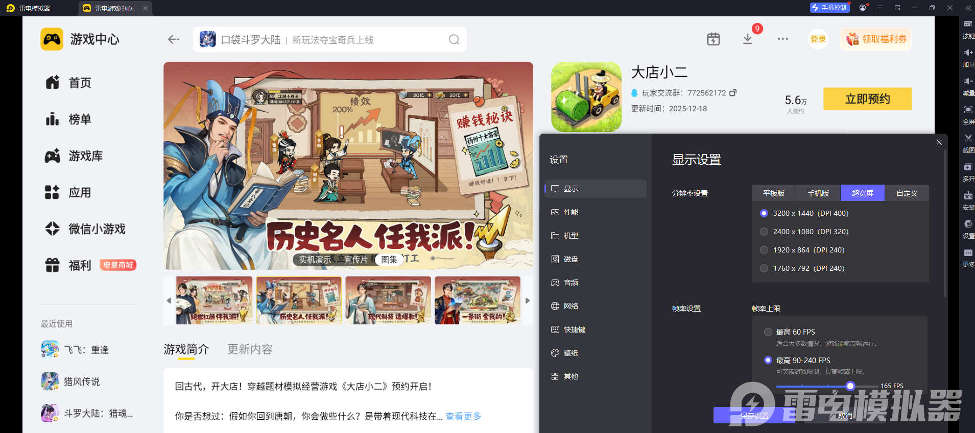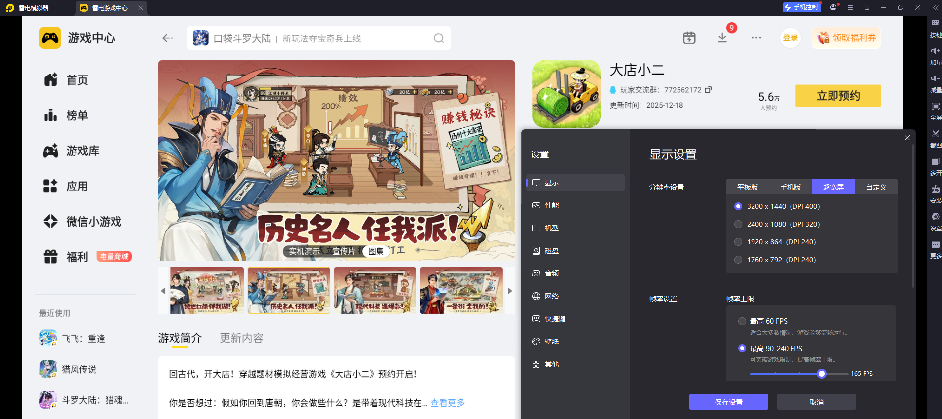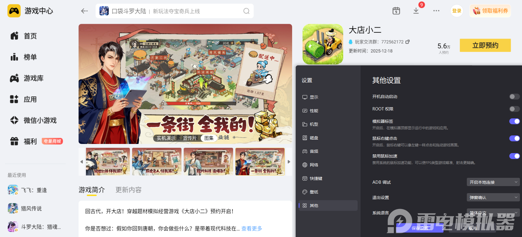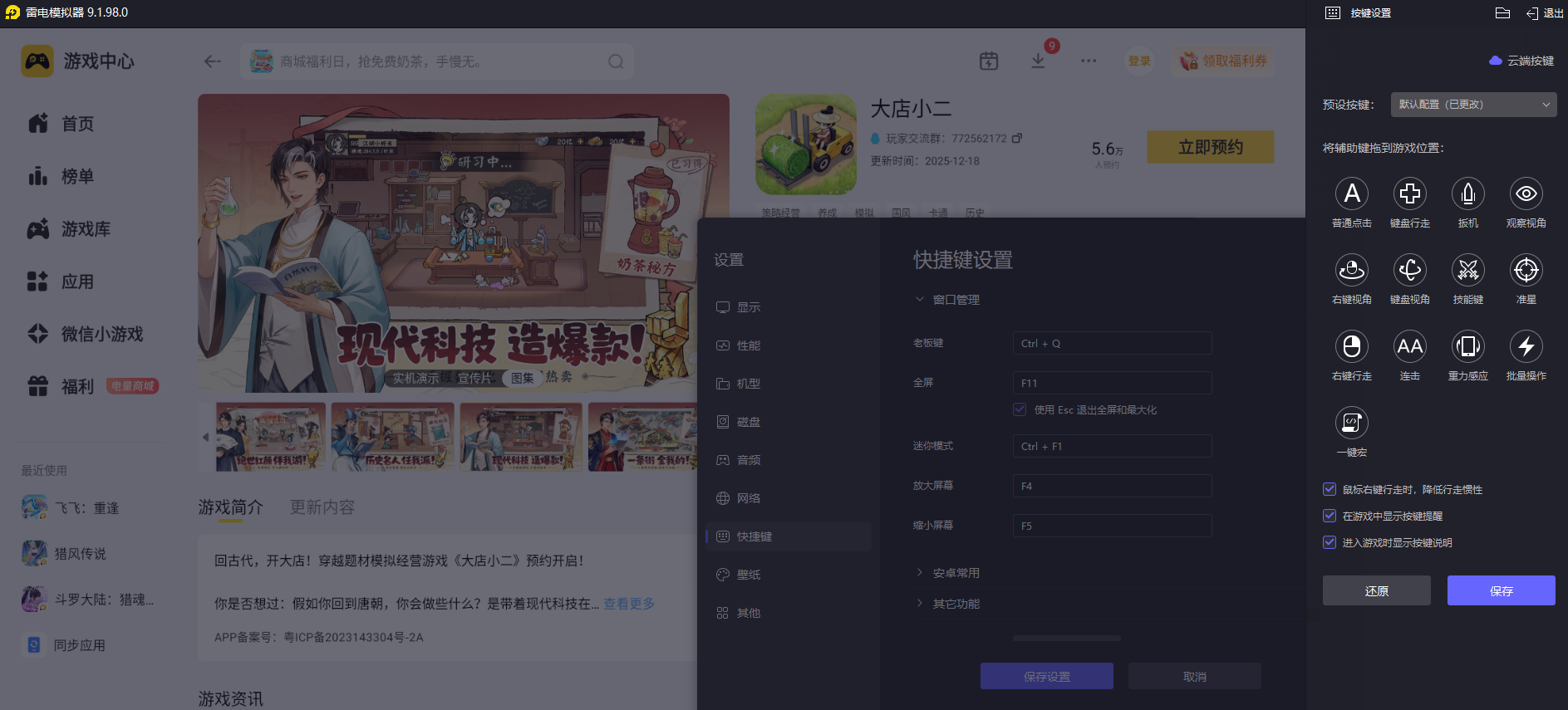 《大店小二》里唐伯虎的玩法涉及不少精细交互,比如专属剧情任务中画稿修复的点选、谜题解谜的按键操作,还有派遣加成时的店铺选择、命格搭配的精准点选,而雷电模拟器支持键鼠自定义映射,能把常用的点选、交互操作绑定到键盘按键,每一次触发任务、派遣门客、选择命格都能精准对应,不会出现操作失误,让游玩节奏完全贴合自己的习惯,操控起来更顺手,也能更专注地体验唐伯虎的专属玩法。