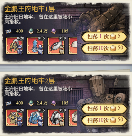 - 关卡解锁:在主线剧情推进过程中,通关各类地牢副本,即可解锁对应关卡,对其进行扫荡;