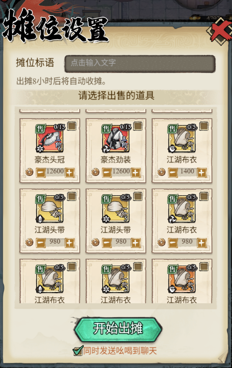 - 防具售卖:除了直接佩戴以外,还可将闲置防具上架至江湖-摆摊区,售卖给其他少侠,换取铜钱资源。