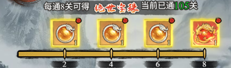 - 累计通关:每通关2、4、6关可以领取到【传奇宝珠】,当通关第8关时,还可以领取【绝世宝珠】,用以兑换绝世侠客!