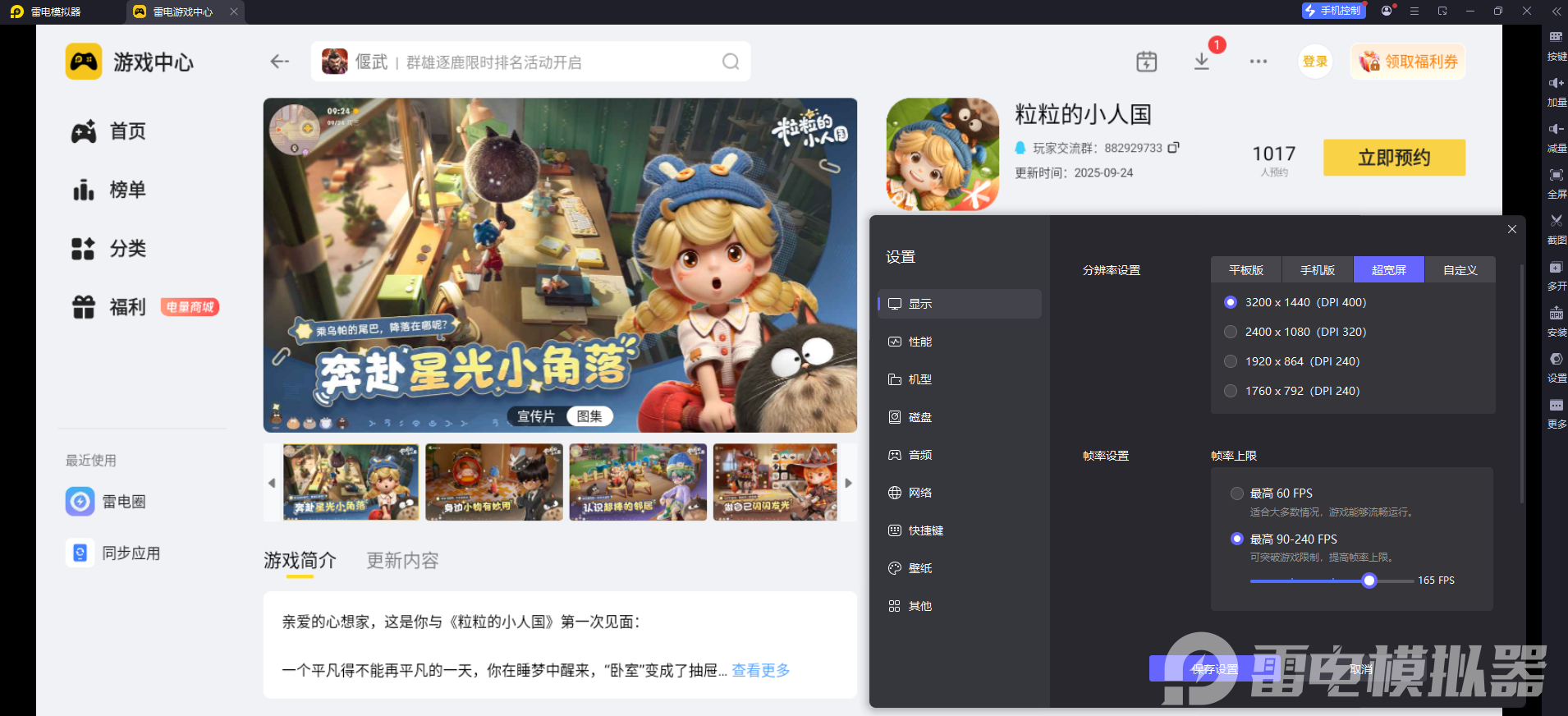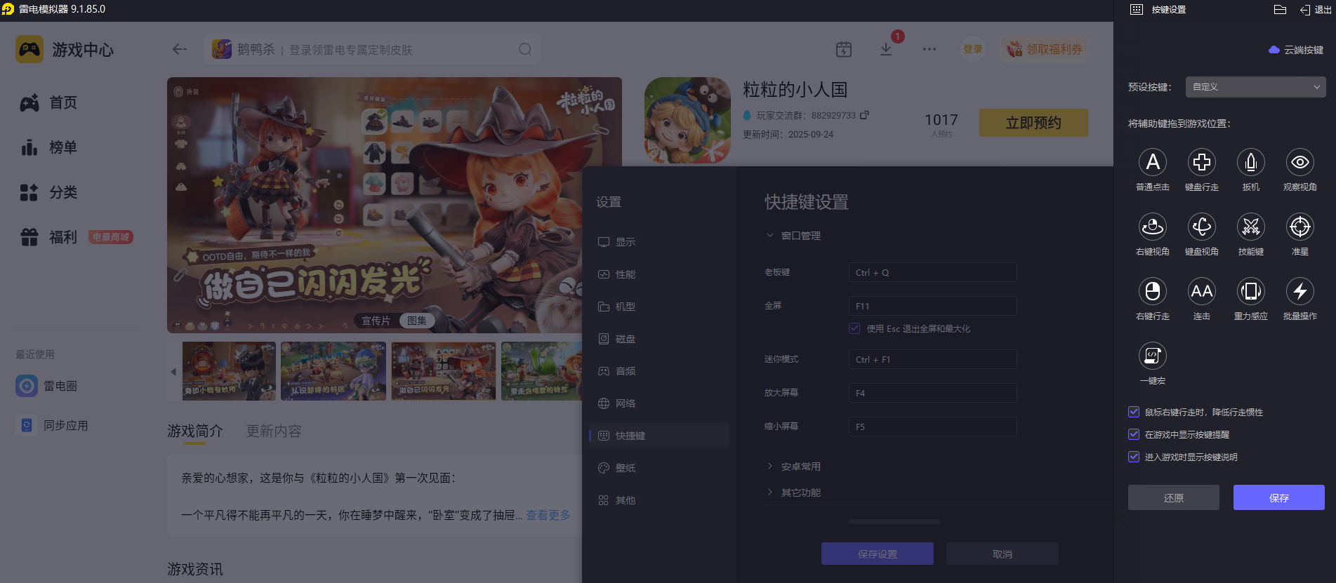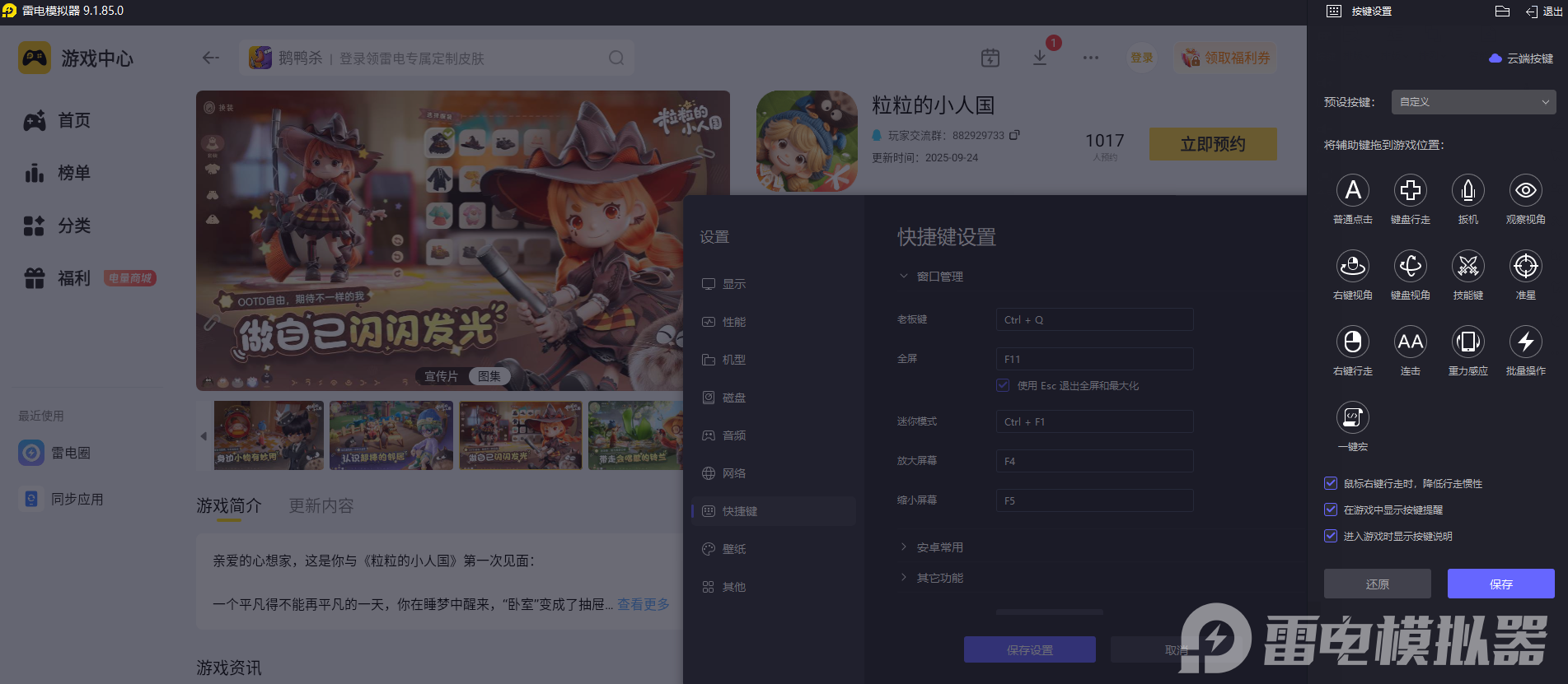 《粒粒的小人国》有着收集资源、布置家园、换装搭配等多样玩法,用雷电模拟器游玩能让体验更出色,尤其在操作和画面两个方面优势明显,游戏里有很多需要精细操作的场景,比如摇晃铃兰收集花蜜、精准布置家园家具、搭配服饰妆容等。雷电模拟器的键鼠映射功能特别实用,玩家可以自定义键盘按键,把移动、收集、确认等操作分配到顺手的按键上,配合鼠标精准定位。不管是连续收集资源,还是细致调整家具位置,都能避免手机触屏的误触和延迟,操作起来又快又准。