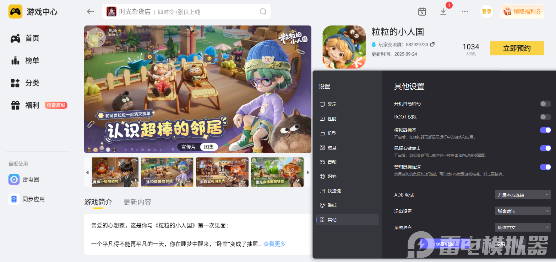 想让《粒粒的小人国》的治愈体验更上一层,推荐通过雷电模拟器预约游玩。雷电模拟器的雷电游戏中心分类清晰,能快速找到预约入口,不仅预约流程简单,还能提前适配游戏配置,等游戏上线后直接一键启动,不用额外繁琐设置。