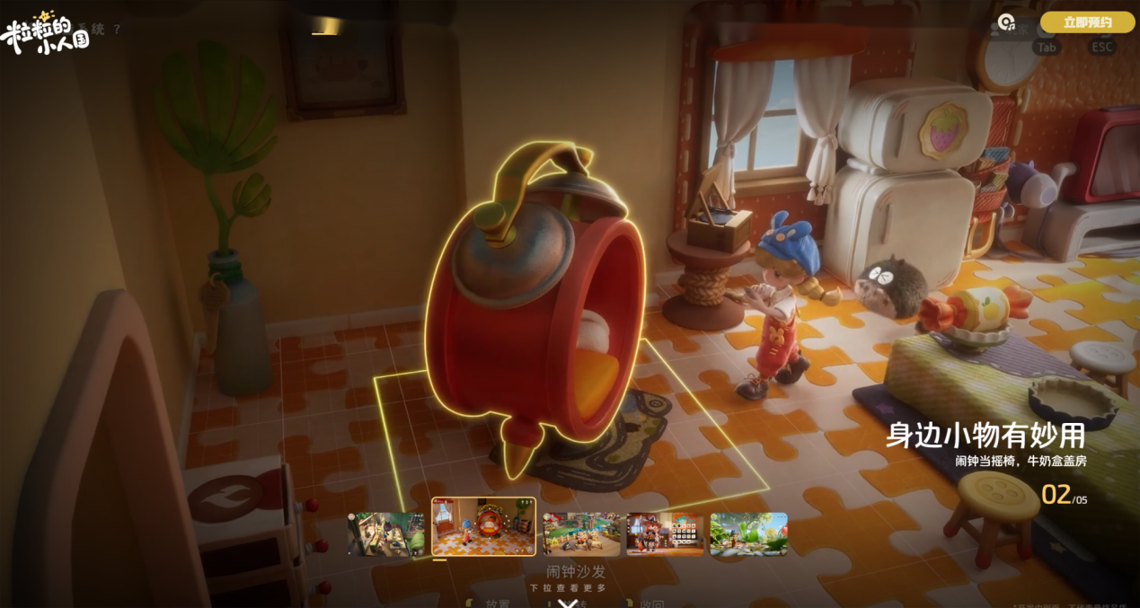 在粒粒的小人国测试服中,你将化身心想家,在名为摇粒乡的微观世界开启慢节奏生活。你可以用缩小枪将太阳镜改造成泳池,让耳机线化作秋千,在书桌一角自由搭建个性化家园;还能借助弹弓、阳光瓶等工具在花海中收集花粉、露珠等充满想象力的资源。与超过100位性格各异的粒粒居民聊天、送礼,逐步解锁它们背后的故事和情感联结——这种深度互动成为推动游戏体验的核心。此外,你还可以体验种植、烹饪、演奏等多元生活模拟,或在暗星深井挑战中倾听情绪的具象化表达,通过闪避和收集星星完成非强制的情感探索。