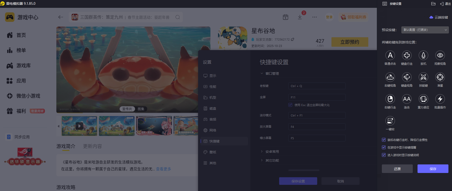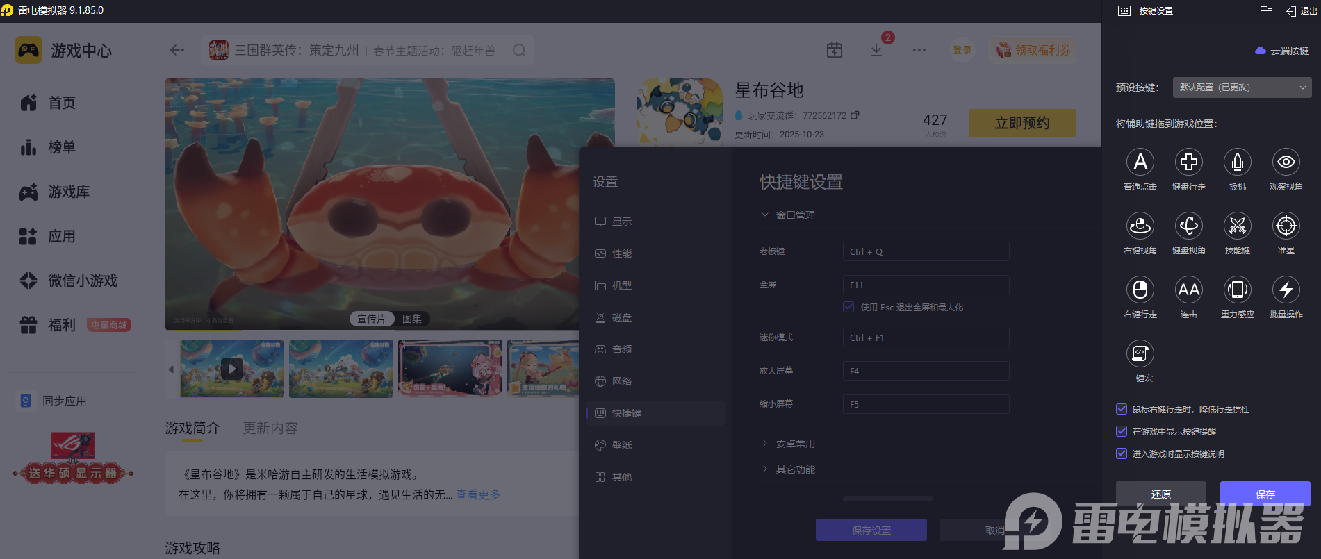 《星布谷地》包含种植、建造、探索、互动等多种操作,玩家在游戏中需要频繁进行点击、拖拽、选择等动作,比如播种浇水、搭建家具、探索遗迹时,都需要精准且顺手的操作方式。雷电模拟器支持键鼠自定义操作,玩家用鼠标点击、拖拽就能完成各项游戏动作,操作精准度更高,搭建建筑、种植作物时会更流畅。