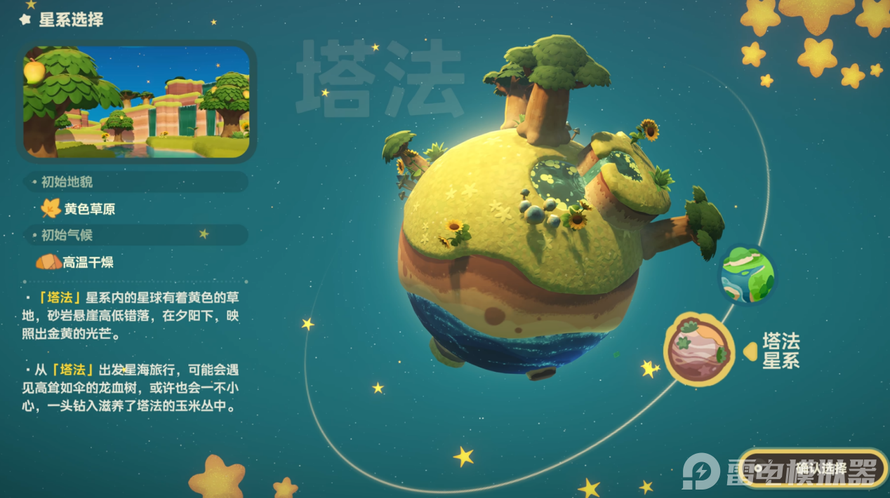 刚进入游戏,系统会提供禾夏星系和塔法星系两个选项,两者的环境、资源、伙伴都不一样。禾夏星系是绿色平原,气候湿润,河网密布,整体是清新的田园风格;塔法星系是黄色草原,气候干燥炎热,还有高低错落的砂岩悬崖,风格更偏向壮阔的荒野。先分清两者的外观和基础环境,才能结合自己的喜好做选择。
